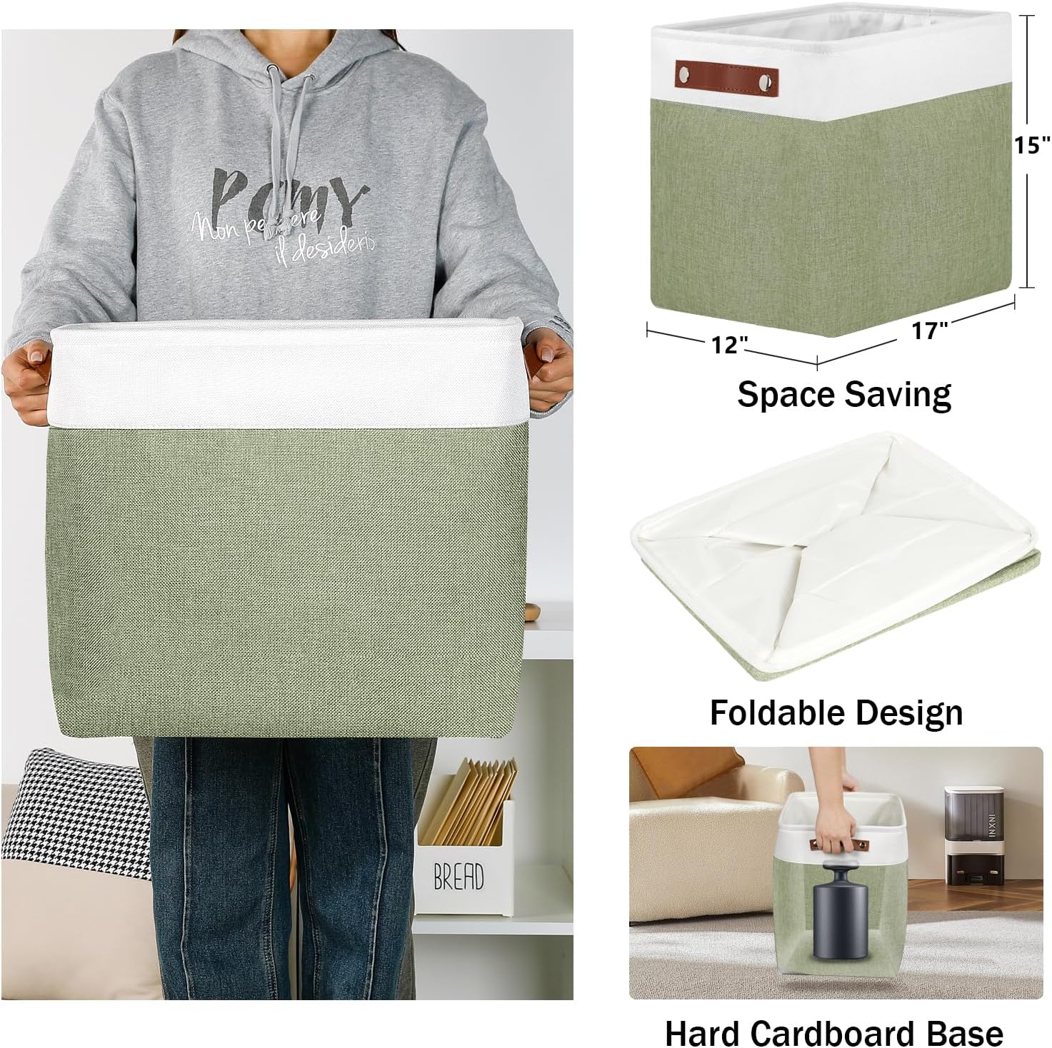 DULLEMELO Extra Large Storage Baskets, 17"x12"x15" Fabric Storage Bins for Organizing Shelves Nursery Toys Books, Collapsible Storage Baskets Rectangular Canvas Bins with Handles, White&Green, 2-Pack