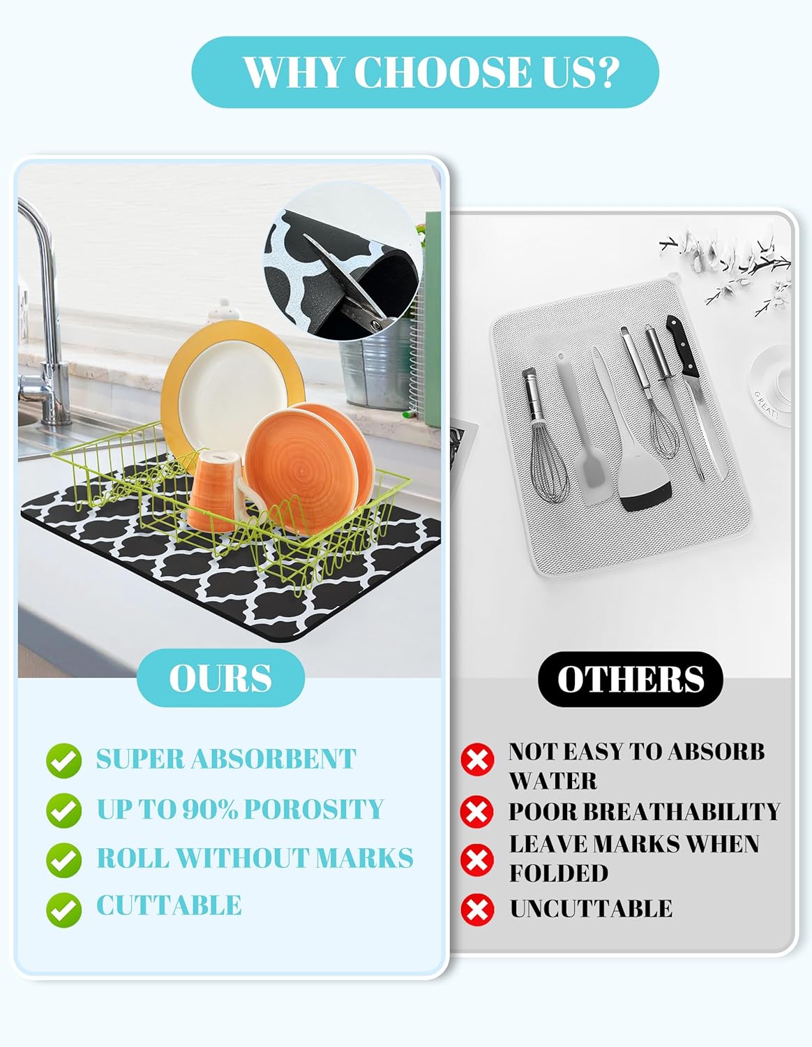 - DISH DRYING MAT: The drying mat is soft and absorbent, Always keep countertops clean and tidy. A practical kitchen mat accessory is definitely worth choosing.
