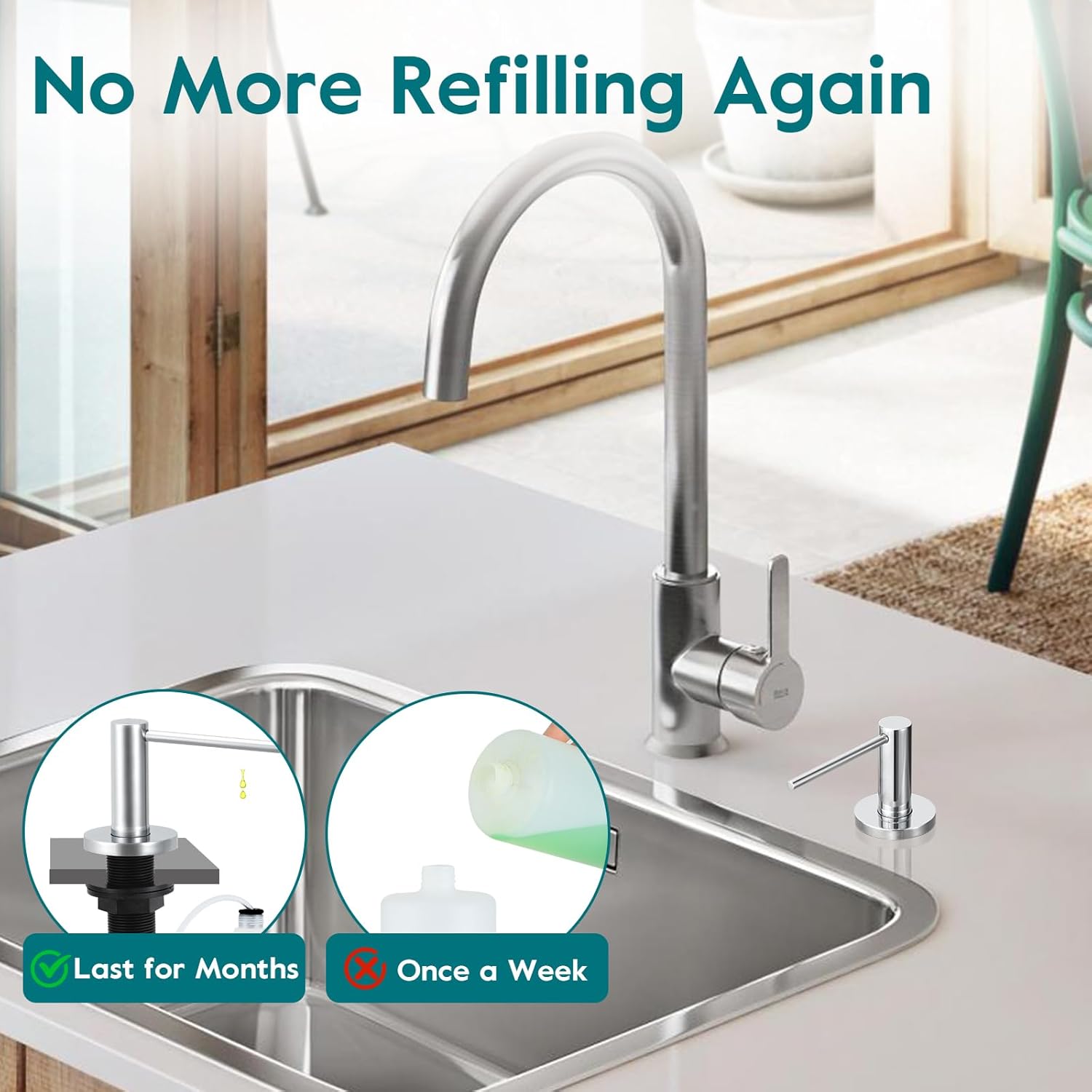 - Easy to Install: You can install this kitchen soap dispenser on any tape of kitchen counter top within a couple of minutes. Note: The first time you use it, you can continue pumping until all the air is out of the tube