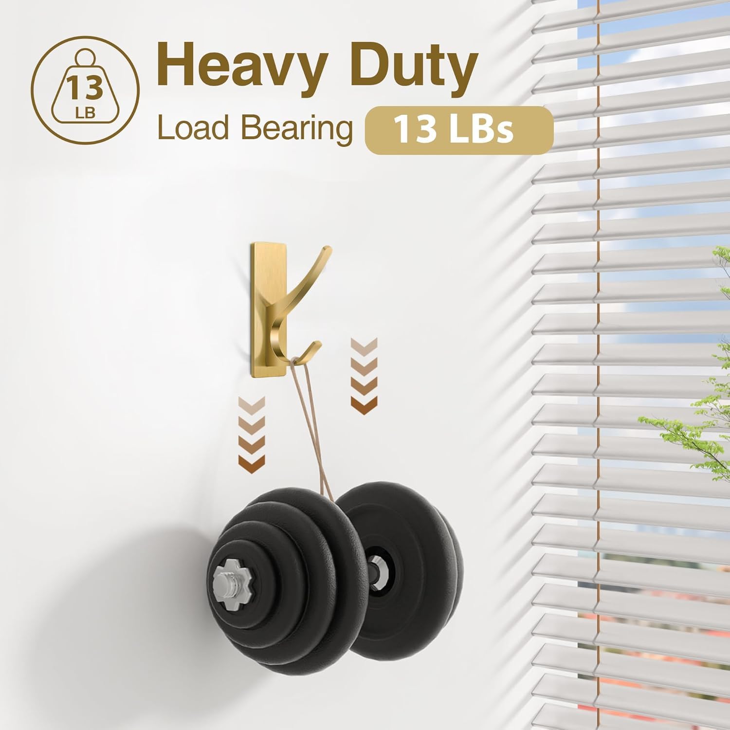 pickpiff Self Adhesive Coat Hooks for Hanging, Heavy Duty Stainless Double Wall Hook for Towel, Backpack, Hat, Sturdy Metal Hanger for Bathroom, Bedroom, Door, Wall Mounted, 4-Pack, Brushed Gold