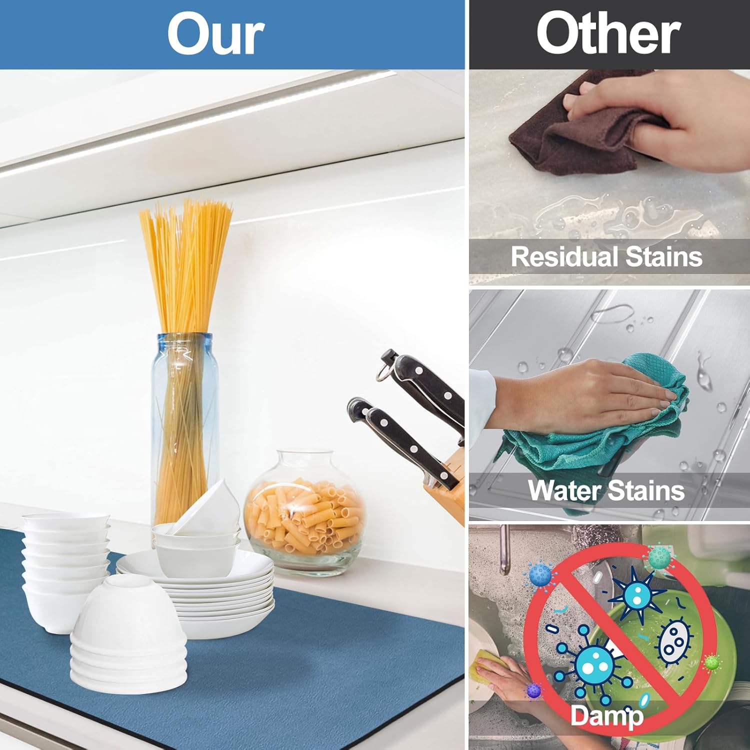 - Anti-slip: The natural rubber bottom of the drying mat has a good anti-slip effect. Prevent water from seeping from below and leave stains on the countertop, keep the kitchen countertop clean for a long time.