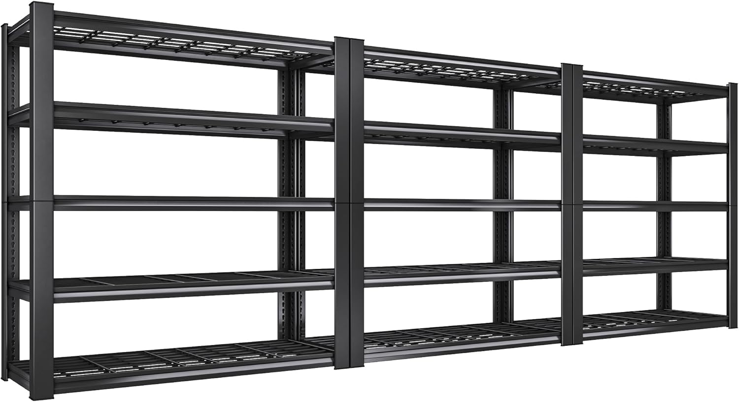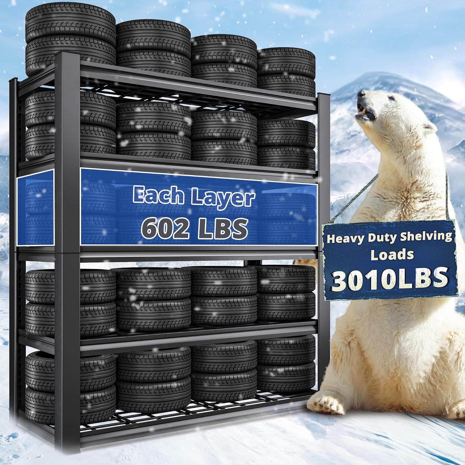 - ă3010LBS Extremely SturdyăThis garage shelving heavy duty has thickened legs. Every solid thickened metal shelf with extra stiffener can hold up to 602 lbs, a total of 3010 lbs bearing capacity gives you good storage experience. No matter how much weight you put on it, the garage storage shelves heavy duty will not wobble or shake