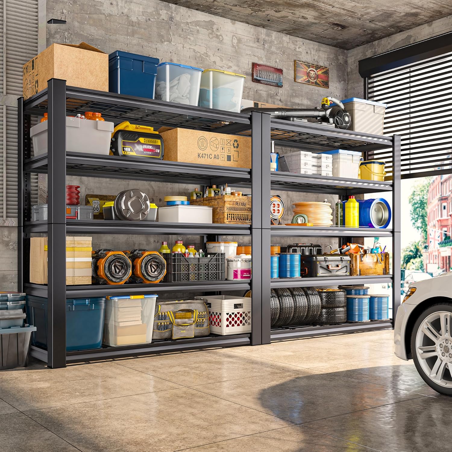 - ă3010LBS Extremely SturdyăThis garage shelving heavy duty has thickened legs. Every solid thickened metal shelf with extra stiffener can hold up to 602 lbs, a total of 3010 lbs bearing capacity gives you good storage experience. No matter how much weight you put on it, the garage storage shelves heavy duty will not wobble or shake