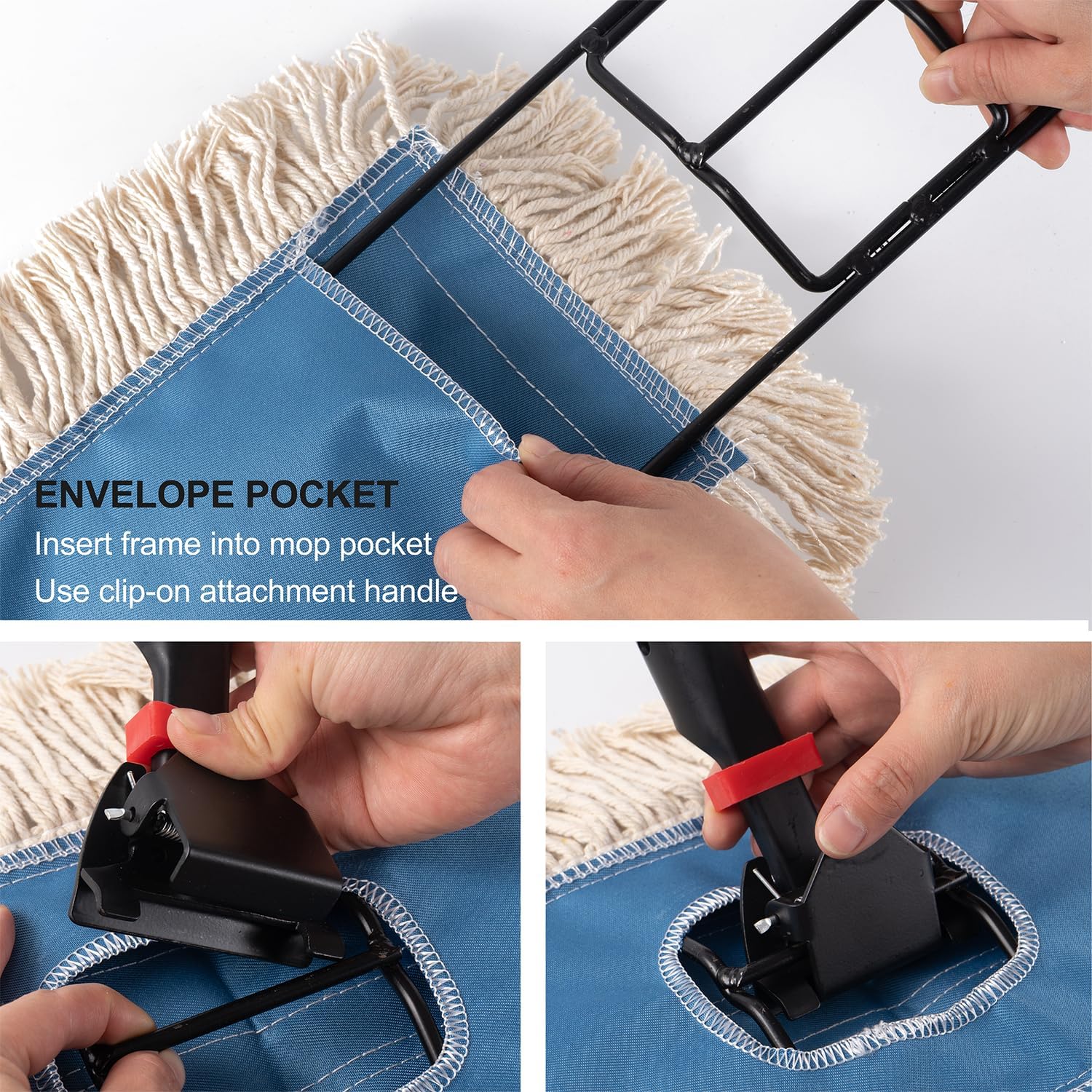 - 5" x 24", fit all standard 24" janitorial mop handle and wire frame. * Note: Mop handle is sold separately* Durable blue top with reinforced binding along the keyhole opening to prevent raveling or fraying.