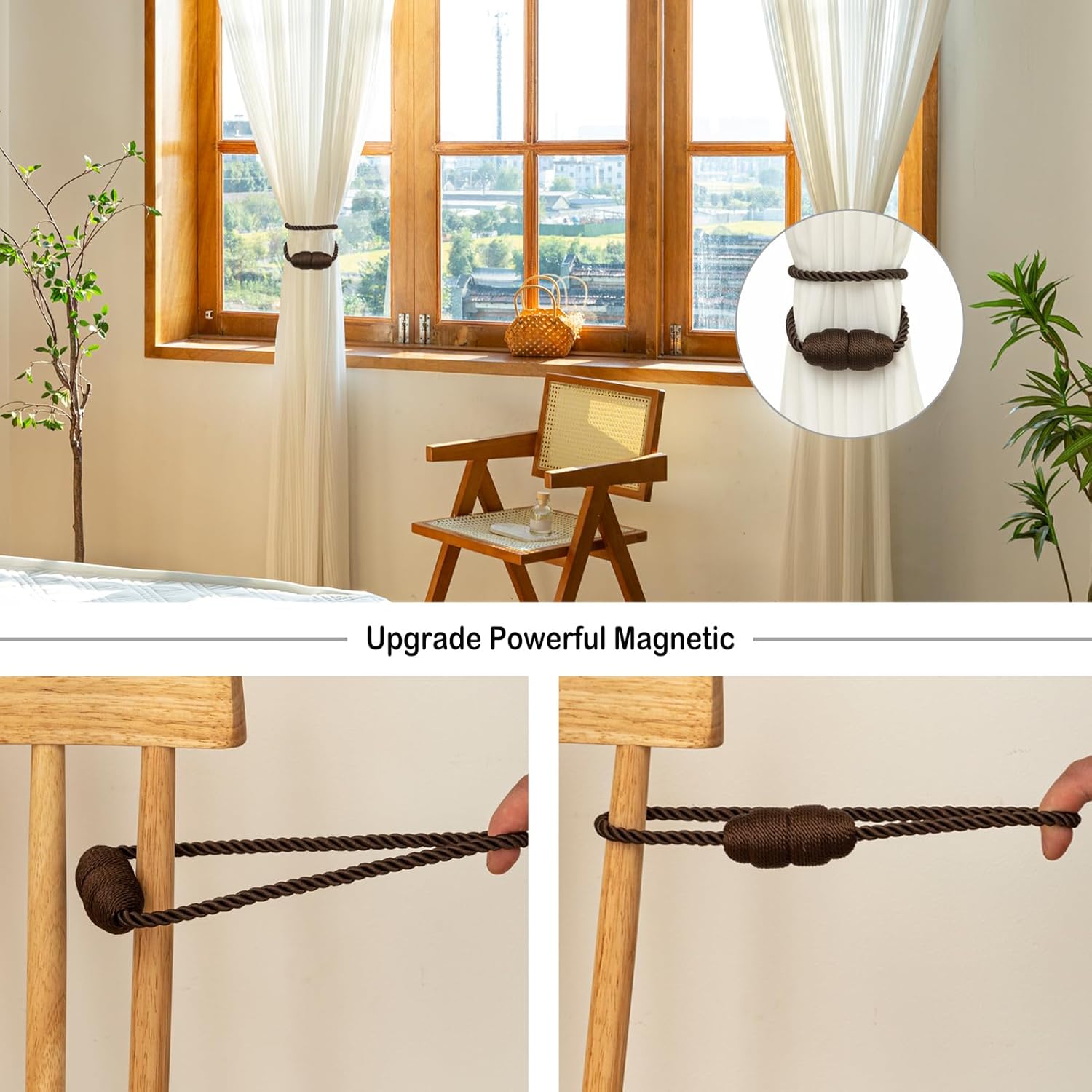 Magnetic Curtain Tiebacks Rope Curtain Tie Backs for Curtains 8 Pack Curtain Holders for Drapes Decorative Window Curtain Holdbacks, Coffee