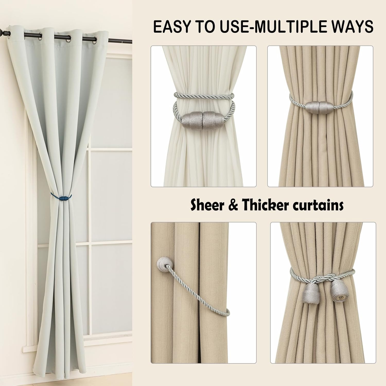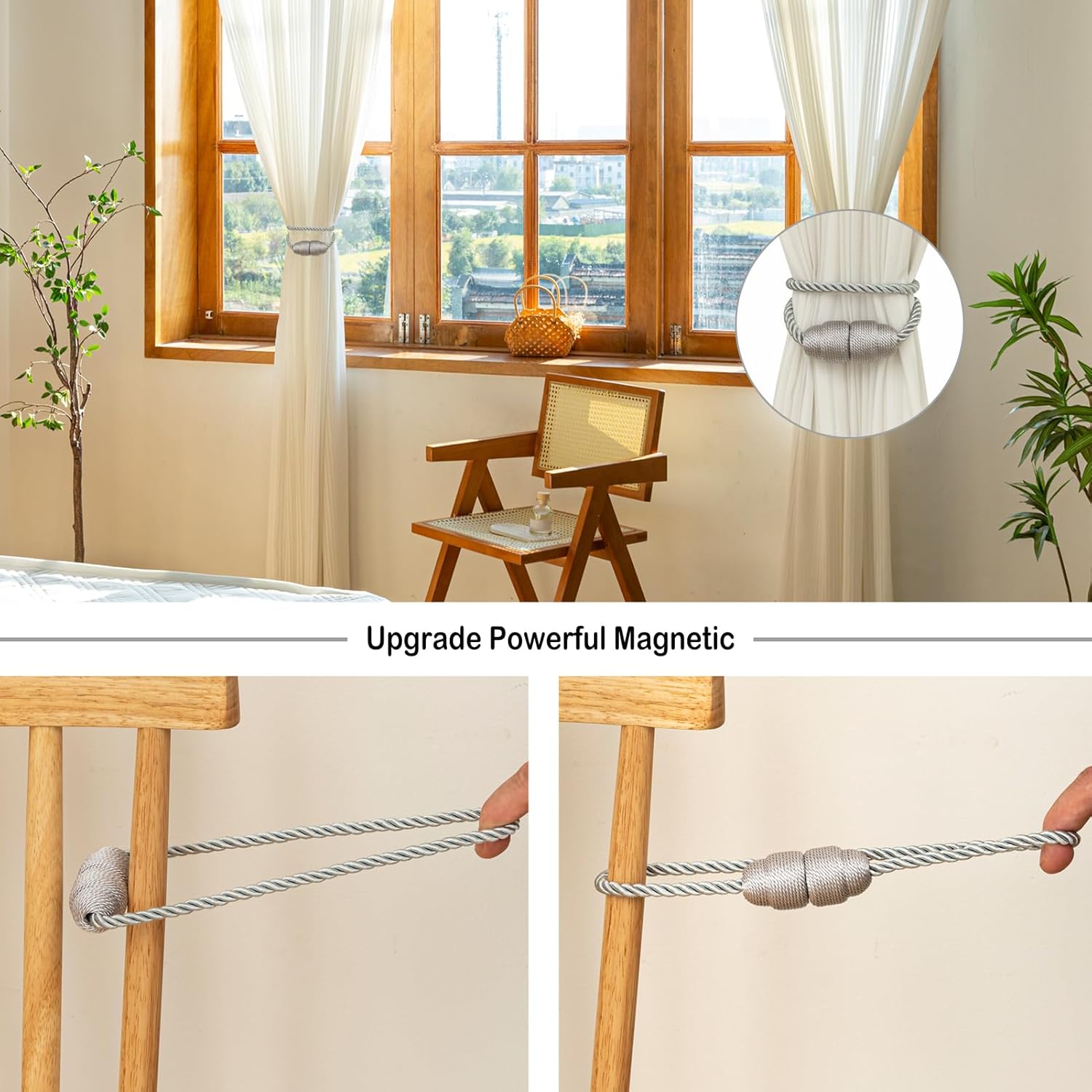 Magnetic Curtain Tiebacks - Rope Tiebacks for Curtains & Drapes, Decorative Window Holdbacks (8 Pack, Grey)