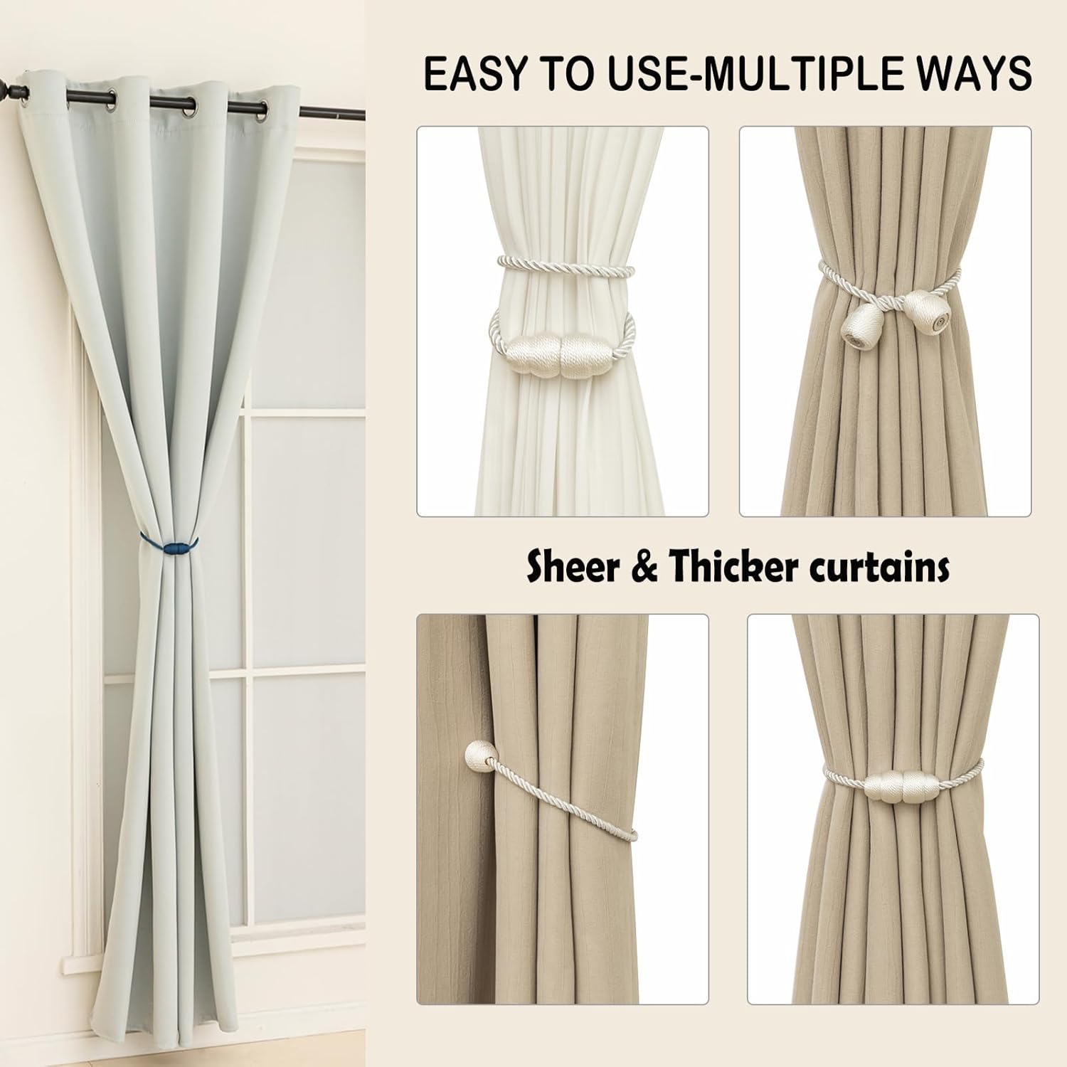 - Simple and easy to use: Our curtain holdbacks have a simple design and are very simple to install and use. Just attach them to the curtains and adjust them as needed. They also untie easily so you can open or close the curtains at any time. Whether you need to increase the practicality of your curtains or enhance the beauty of your room with decorative accents.