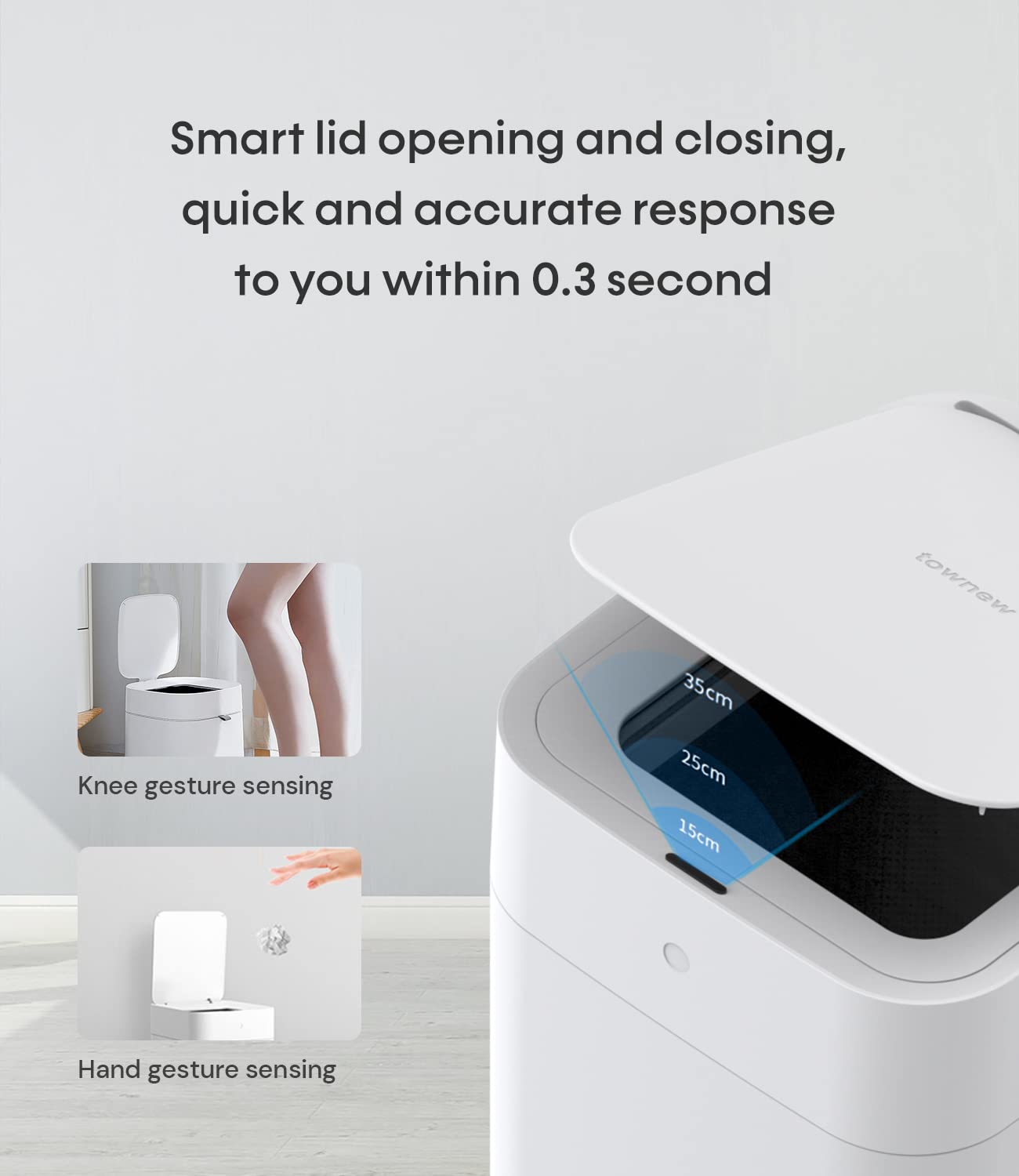 - ăTouch-free Motion Sensor LidăThe automatic garbage can is equipped with latest Infrared Motion Sensor that detects movement and all approaching objects within 14 inches above the sensor panel to open the lid immediately. ăLid Opening Mode by One-Click ButtonăThe townew smart trash can tap the touch button on the front to instantly turn on lid opening mode and press the button again to turn off lid opening mode.