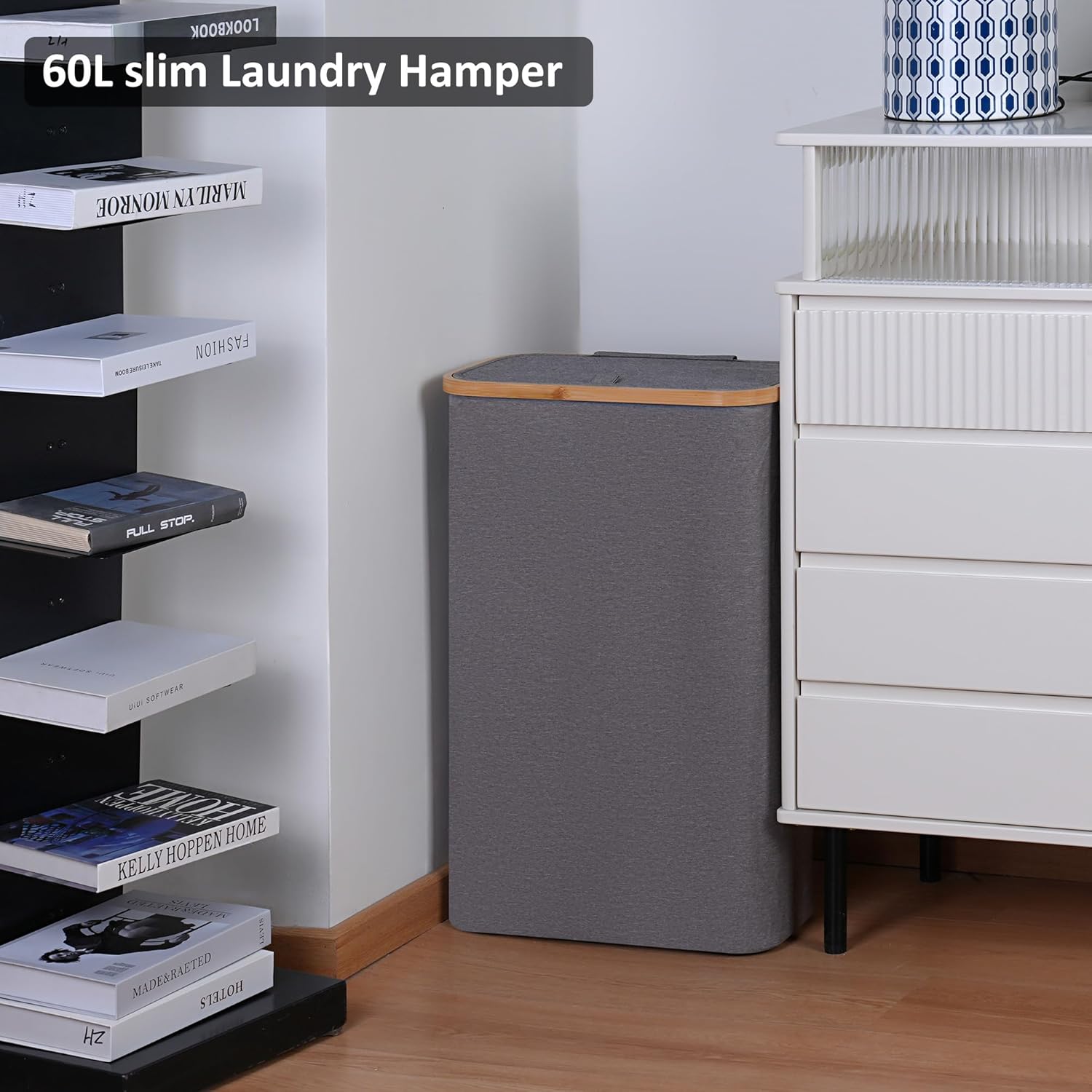 Slim Laundry Basket,60L Laundry Hamper with Lid, Tall Hamper for Laundry,Dirty Cloth Hamper with Bamboo Handle for Toys,Towels, Clothes Organizing,Grey