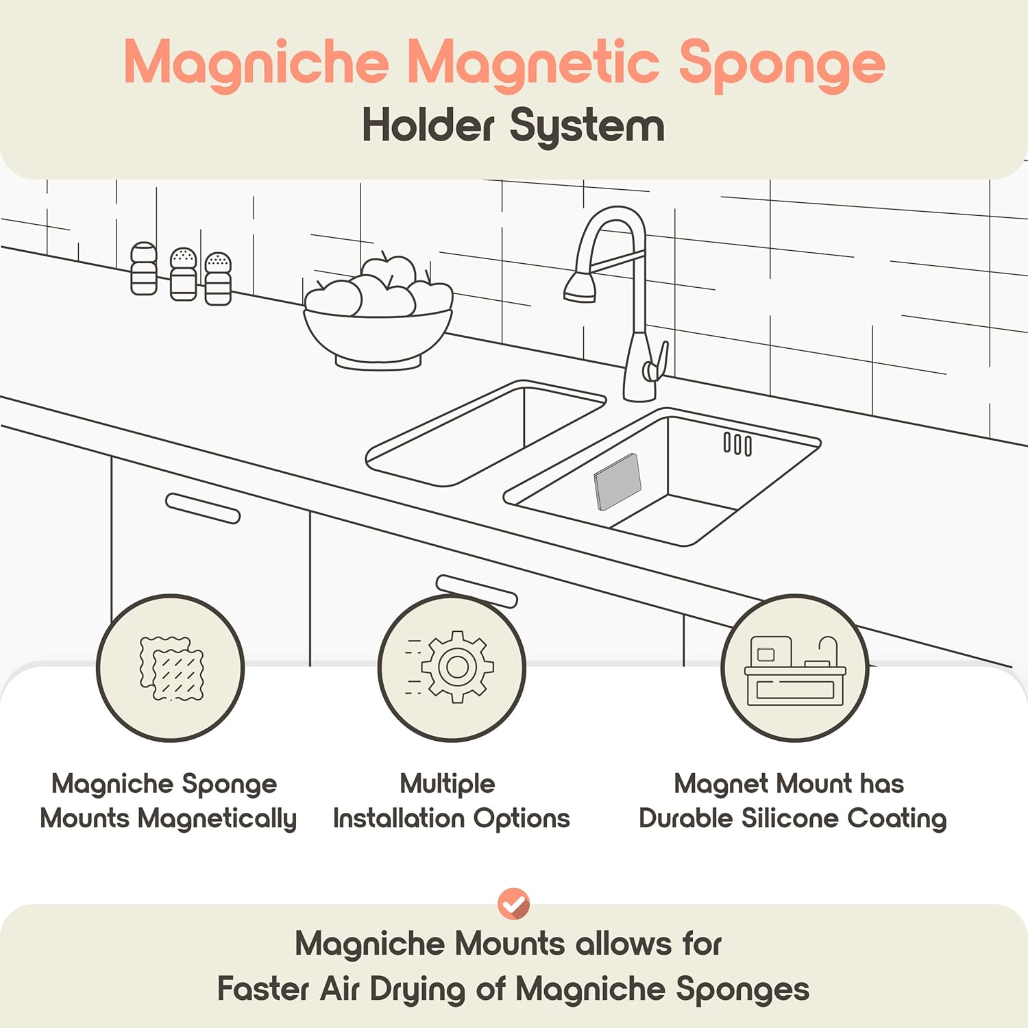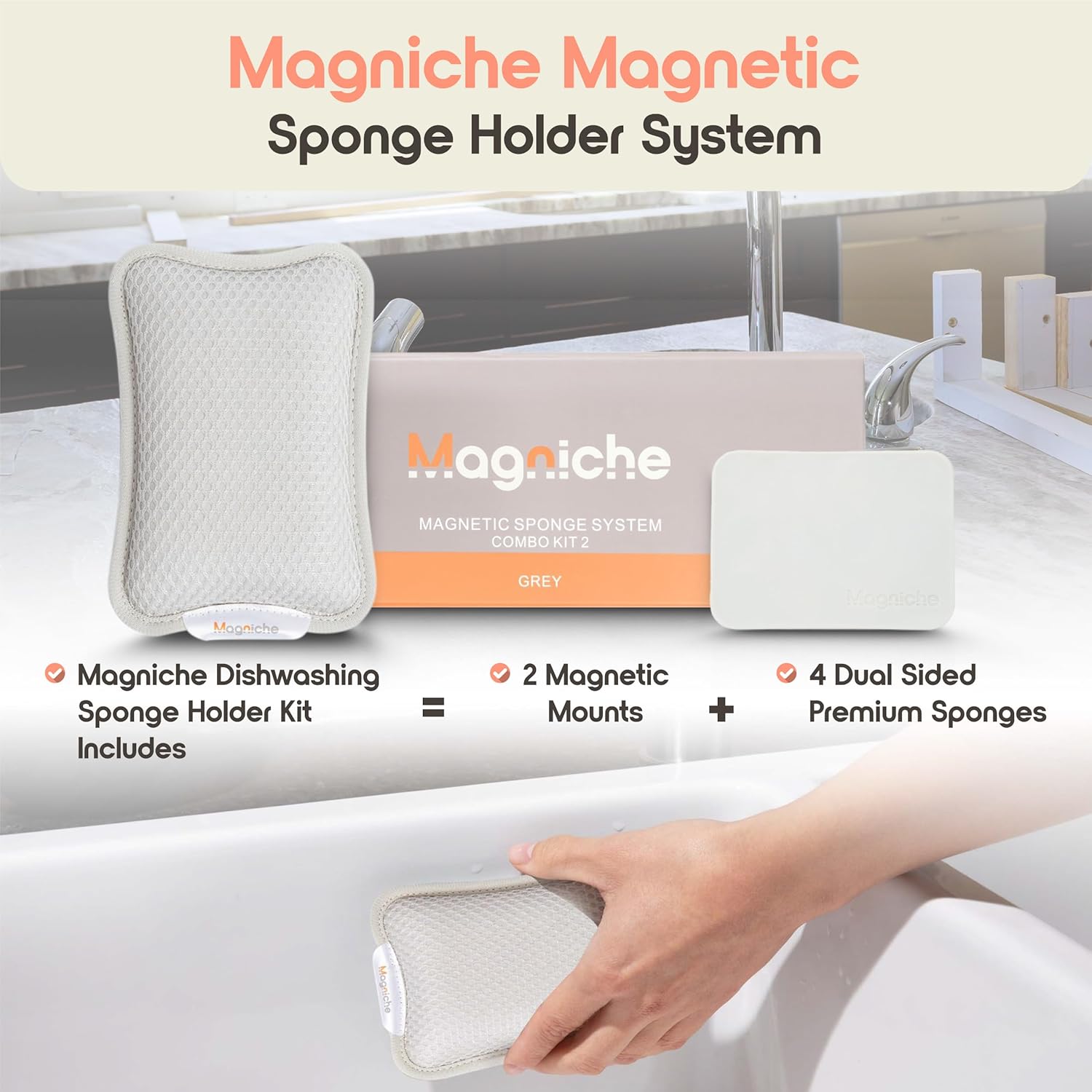 - ππ‘π‘π’π©ππ§ππ©π π π’π¨π‘π§ππ‘π π¦π¬π¦π§ππ : The Magniche magnetic sponge system includes two strong holdersβone for inside and one for outside the sink. Ideal for kitchen scrubbers and reusable sponges for dishes for users who want a clean, drill-free solution that stays put, even with wet hands.
