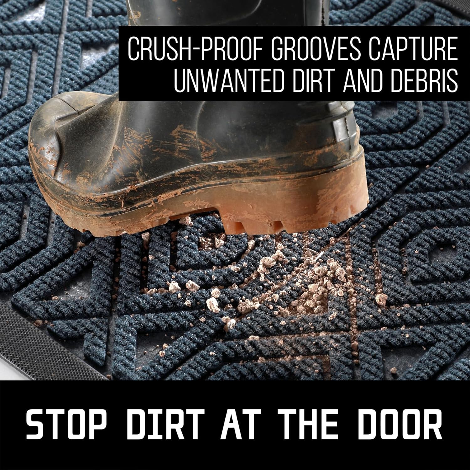 - [CAPTURE DIRT AND MOISTURE] Yimobra front door entryway mat outdoor with unique pattern design, forming a detention dam extending in all directions, helping to capture dirt, dust, gravel, mud, sand, grass or other messy debris and prevent them from entering Indoor; The surface of floor mat beautifully woven polyester fabric absorbs moisture, and the sturdy oblique rubber edge will not accumulate water in rainy and snowy days, keeping your home dry and clean
