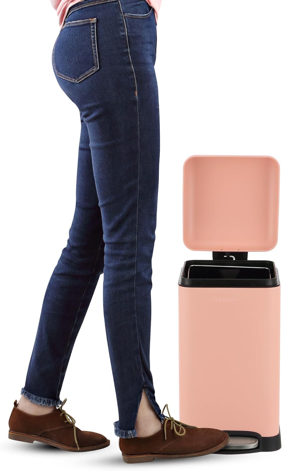 - Hands-free step pedal with a built-in damper to gently lower the lid