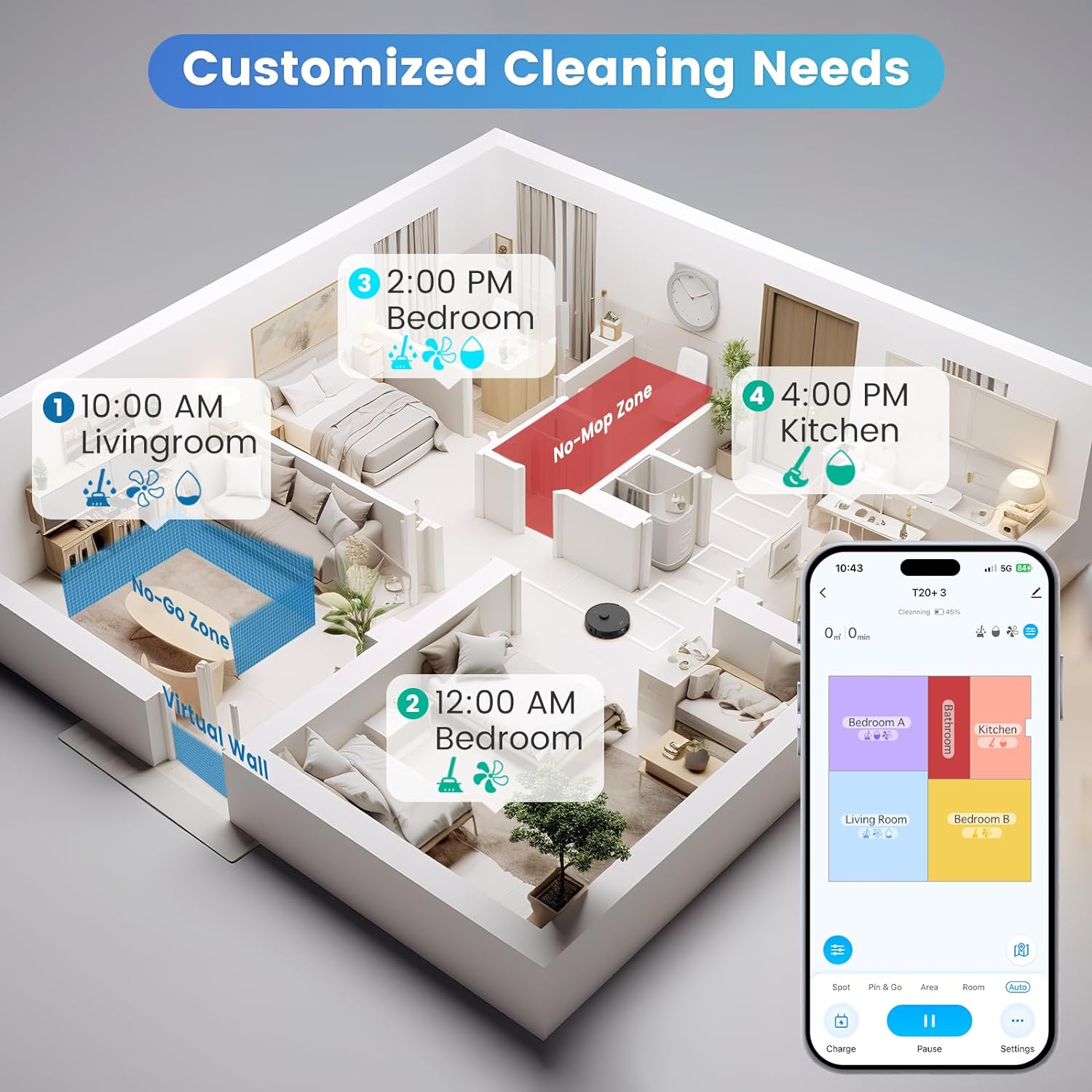- Smart App & Voice & Remote Contro: Via Smart App to set the cleaning schedule, change the cleaning modes, suction levels, etc. You can create No-Go Zones to keep it from getting stuck in narrow spaces and virtual walls to prevent it from entering particular areas. The home robot vacuum can be controlled via the App/Remote/Alexa/Google Assistant. *Only support 2.4GHz WiFi.