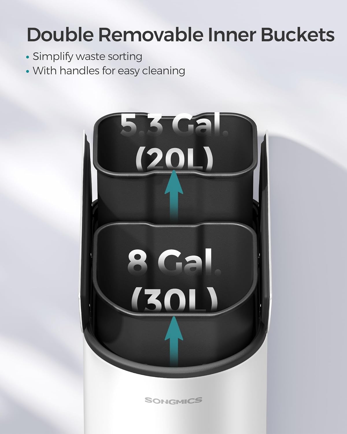 - [Slim Dual-Compartment Bin] This dual trash can, with capacities of 5.3 gallons and 8 gallons, conveniently sorts regular waste from recyclables. Its slim profile perfectly fits into narrow spaces, making kitchen waste management a breeze