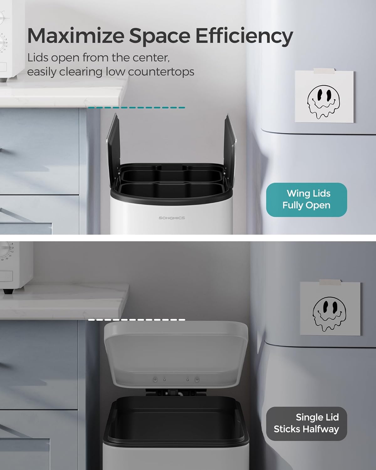 - [Efficient Wing Lids] The lids open from the center to easily clear low countertops for maximum space efficiency. The rounded corners prevent tearing of bags during removal