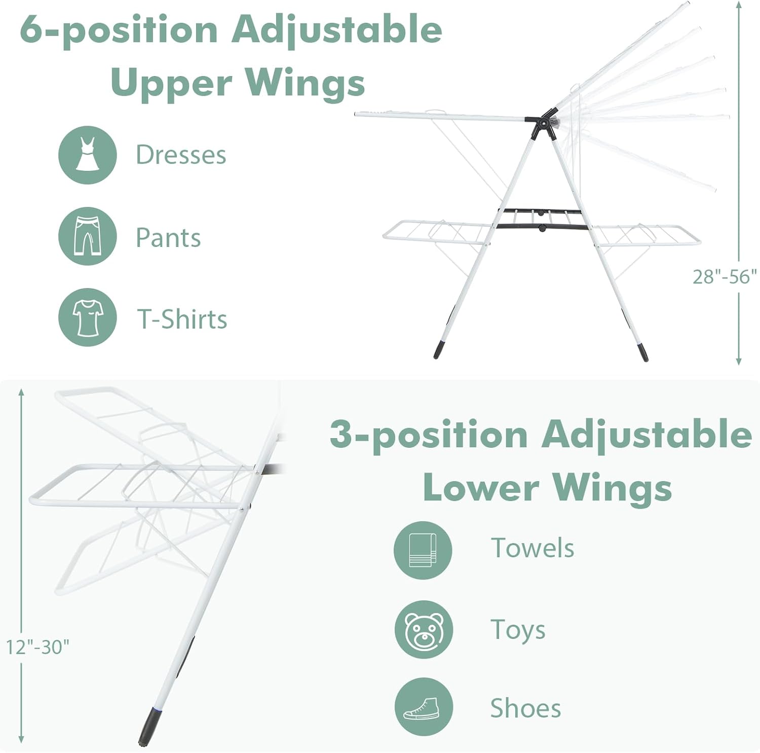 - [Adjustable Wings & Useful Clips]: With 6-position adjustable upper wings (28"-56") and 3-position adjustable lower wings (12"-30"), this drying rack offers versatile hanging options for items of different lengths. Besides, the rack also comes with practical sock clips, enhancing the hanging spaces for small items like socks and tank tops.