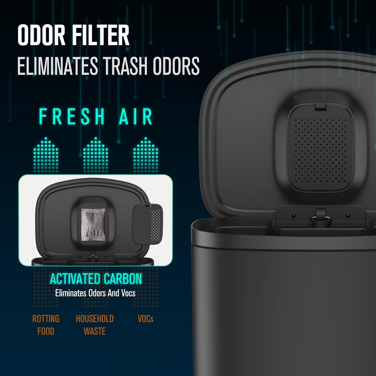 - Odor Control and Convenience: The curved surface top lid not only enhances the modern aesthetic but also conceals a convenient storage space for deodorizing products, keeping unpleasant odors at bay. Plus, we include 30 garbage bags for added convenience, saving you time and hassle.