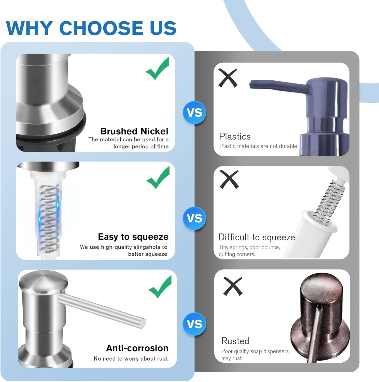 - Very Durable : Our kitchen sink soap dispenser is made of Brushed Nickel stainless steel on the outside, which has been treated with brushed nickel to prevent decay and rust; The under counter soap dispenser for kitchen sink is suitable for most countertops (granite, stainless steel, wood glass and others
