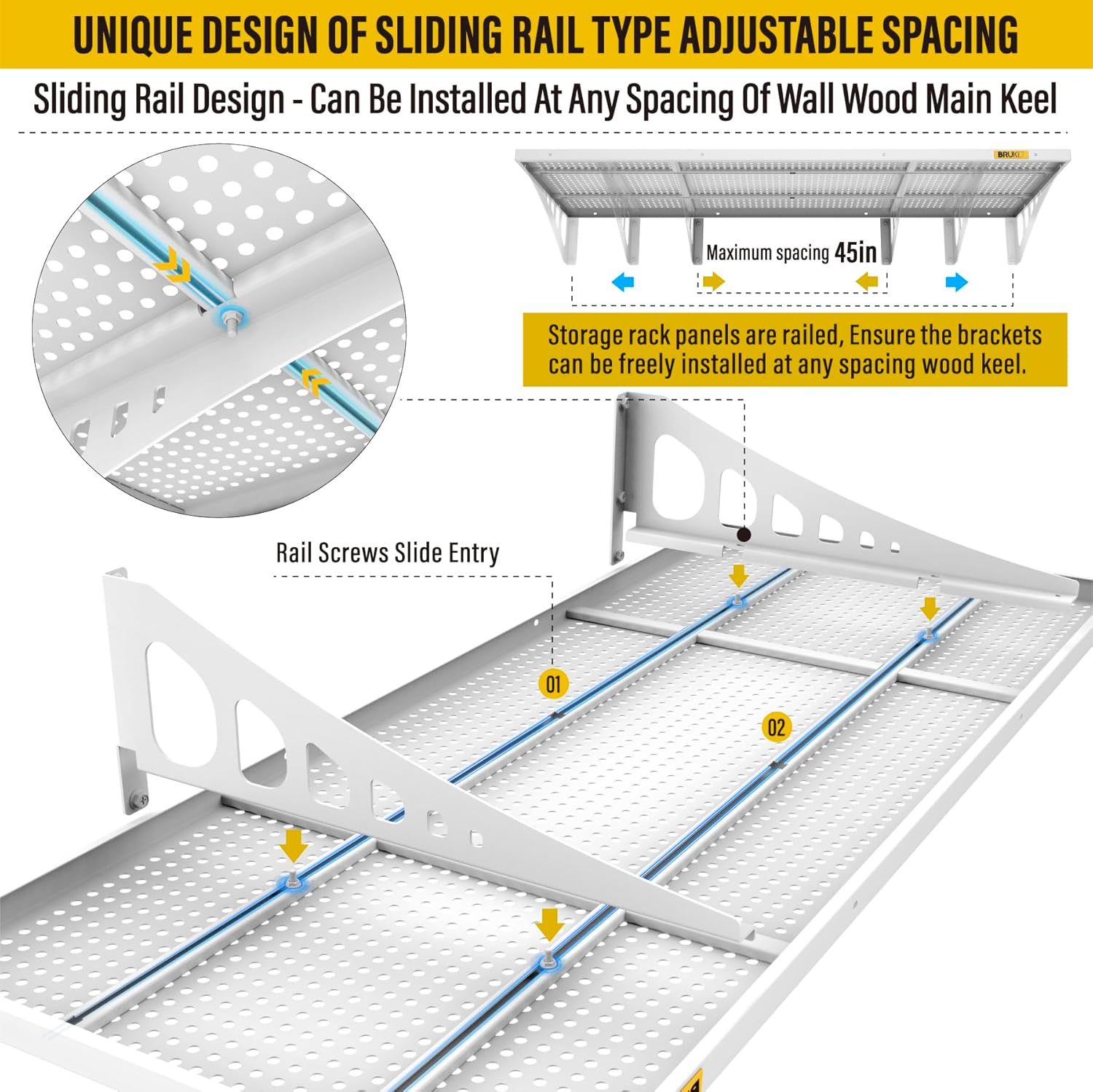 - SUPERIOR DESIGN: Wall shelf garage storage rack panel is made of whole piece of perforated steel plate bending and welding, the surface of matte high temperature powder baking paint, flat and smooth; the panel adopts slide rail design, can be adjusted by parallel left and right sliding at will; bracket can be freely installed in 45” range of the spacing of the wood wall keel, without affecting the precision connection with the panel, eliminating the worry of being unable to docking due to the mismatch of spacing points of load-bearing wood wall keel or inaccuracy of the installation of the bracket. It saves time and labor