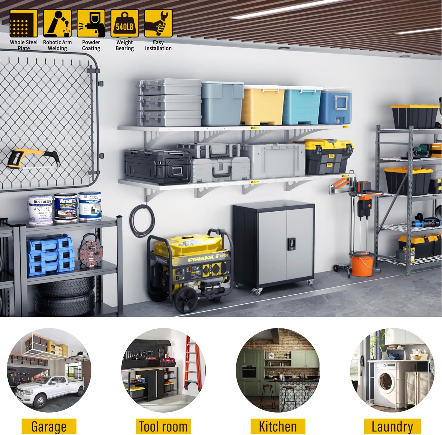 - SUPERIOR DESIGN: Wall shelf garage storage rack panel is made of whole piece of perforated steel plate bending and welding, the surface of matte high temperature powder baking paint, flat and smooth; the panel adopts slide rail design, can be adjusted by parallel left and right sliding at will; bracket can be freely installed in 33” range of the spacing of the wood wall keel, without affecting the precision connection with the panel, eliminating the worry of being unable to docking due to the mismatch of spacing points of load-bearing wood wall keel or inaccuracy of the installation of the bracket. It saves time and labor