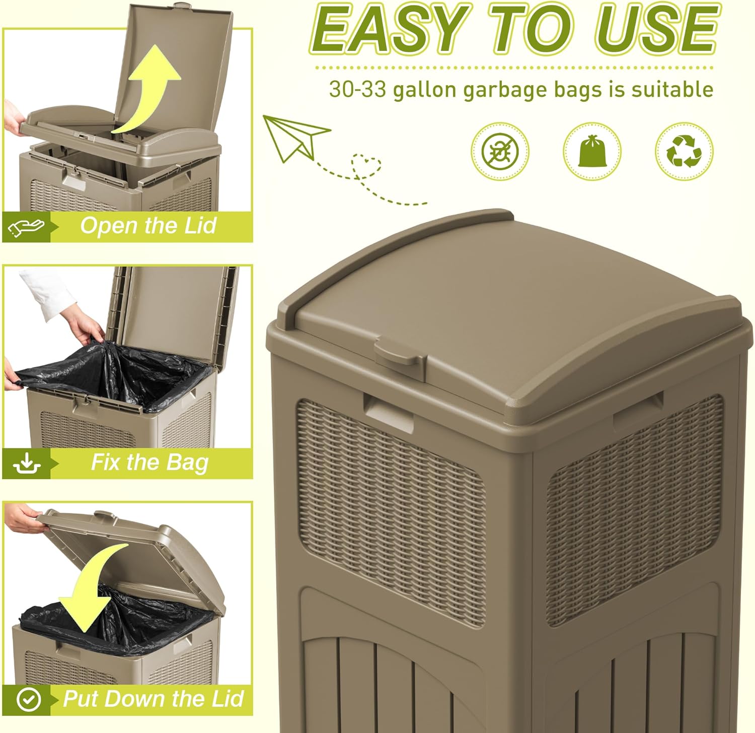 Greesum 33 Gallon Resin Outdoor Trash Can with Lid, Waterproof Resin Garbage Bin for Hideaway, Patio, Deck, Light Brown