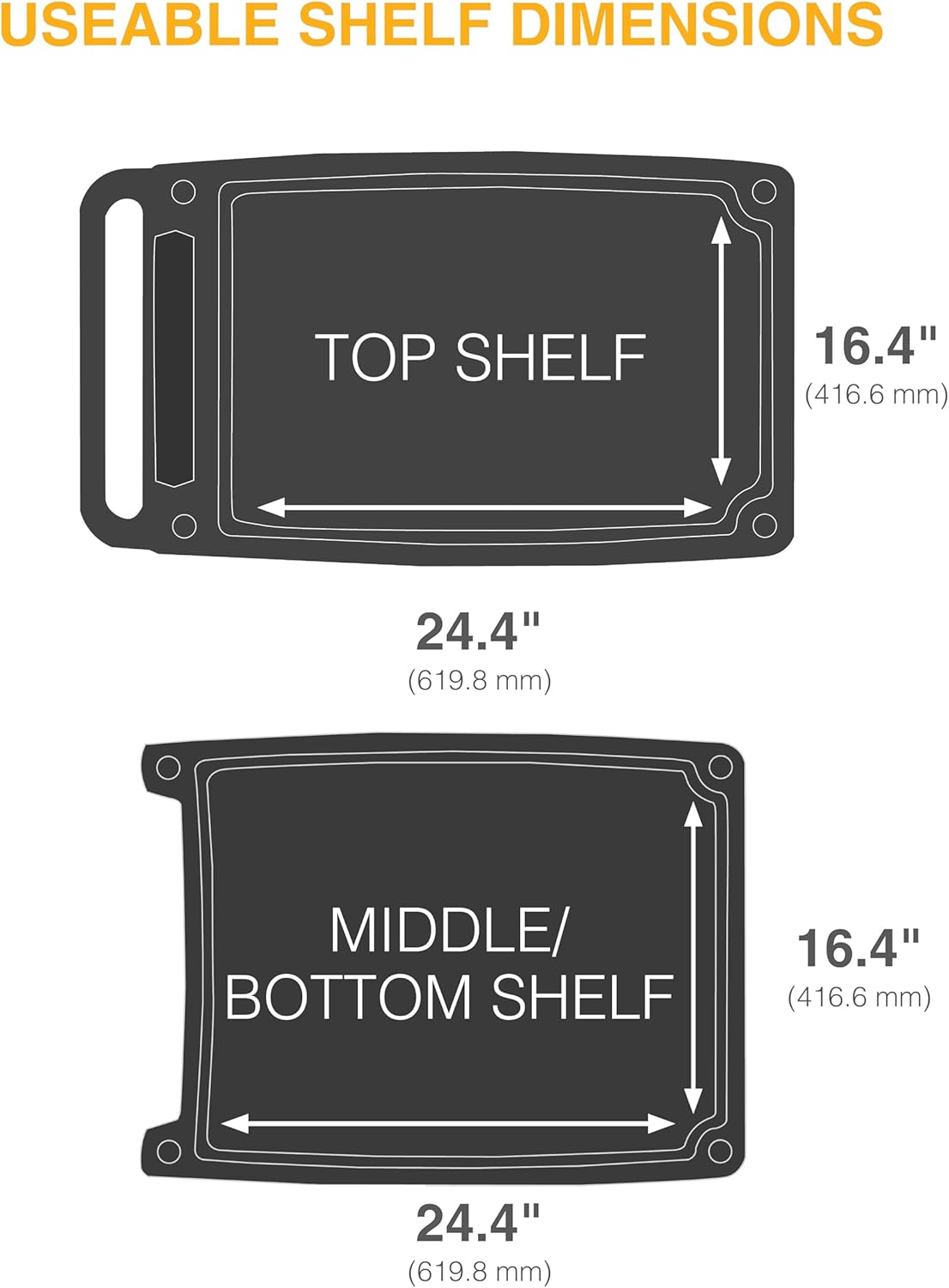 - Built to Handle the Toughest Loads: Triple your storage solutions with this 3-shelf cart. With a maximum weight capacity of 400 lbs (181 kg), this cart allows you to conquer even the most demanding storage challenges. Each shelf can handle up to 150 lbs (68 kg) of tools, supplies, or equipment, keeping everything organized and readily accessible.