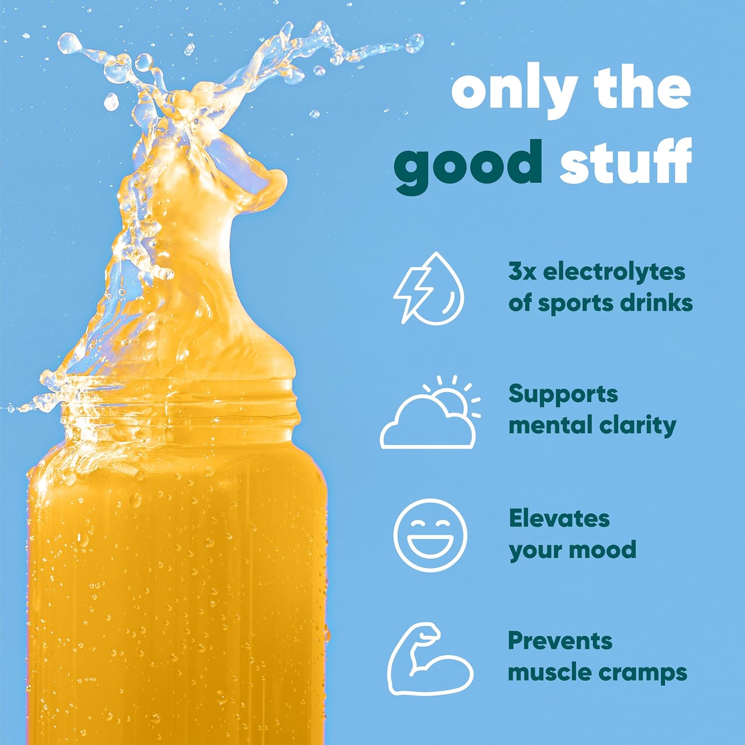 - Product Benefits : Everyday Hydration; Supports Mental Clarity, Focus, and Mood; Prevents Muscle Cramps; Pre and Post Workout; Relieves Dehydration Everyday Hydration; Supports Mental Clarity, Focus, and Mood; Prevents Muscle Cramps; Pre and Post Workout; Relieves Dehydration