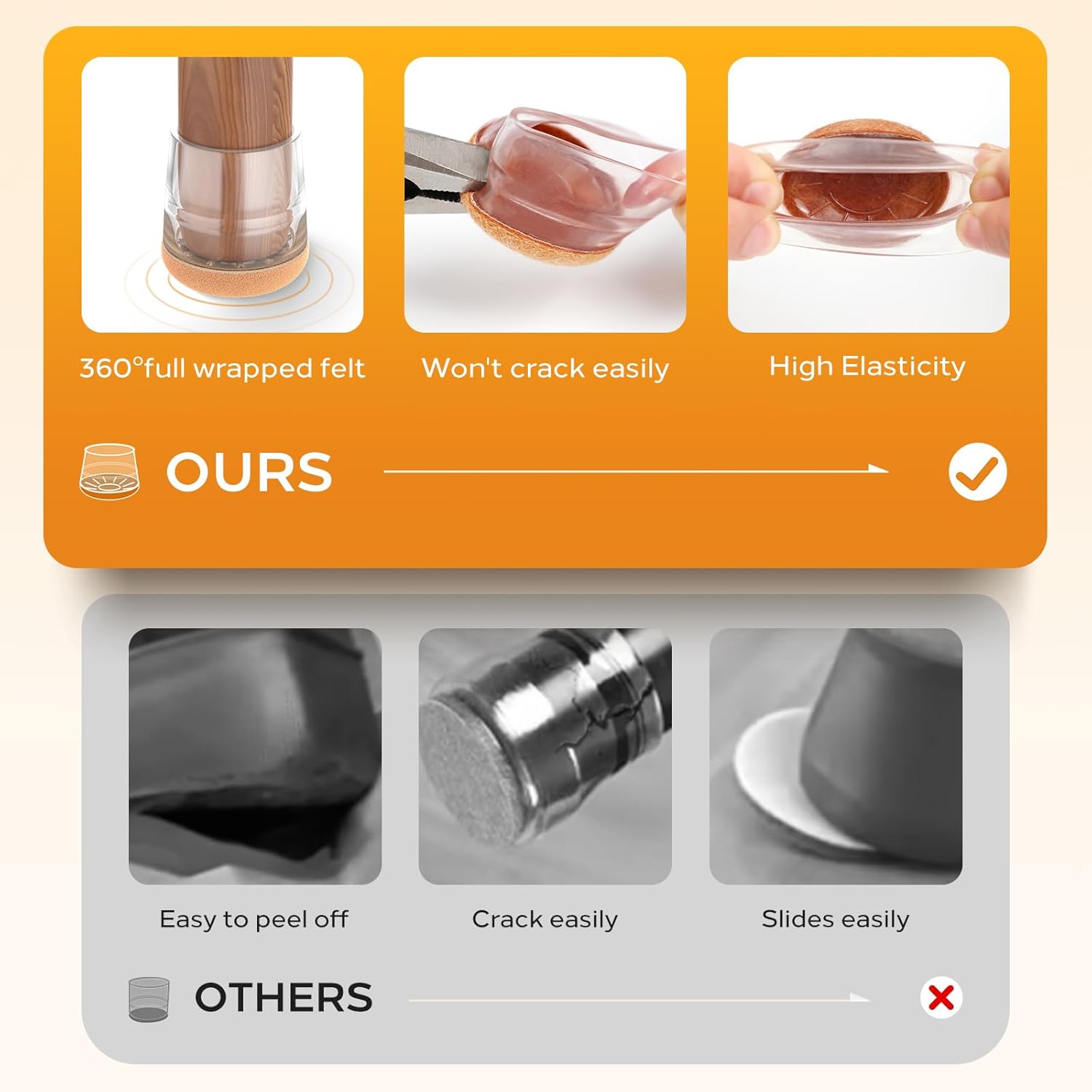 - Enhanced Felt & Wear Resistance- With a 360° fully enveloping felt bottom design and heightened felt thickness, engineered to accommodate various angles of slanted chair legs. Our chair leg floor protectors have a stretch, and elasticity which can maintain longer usage time.
