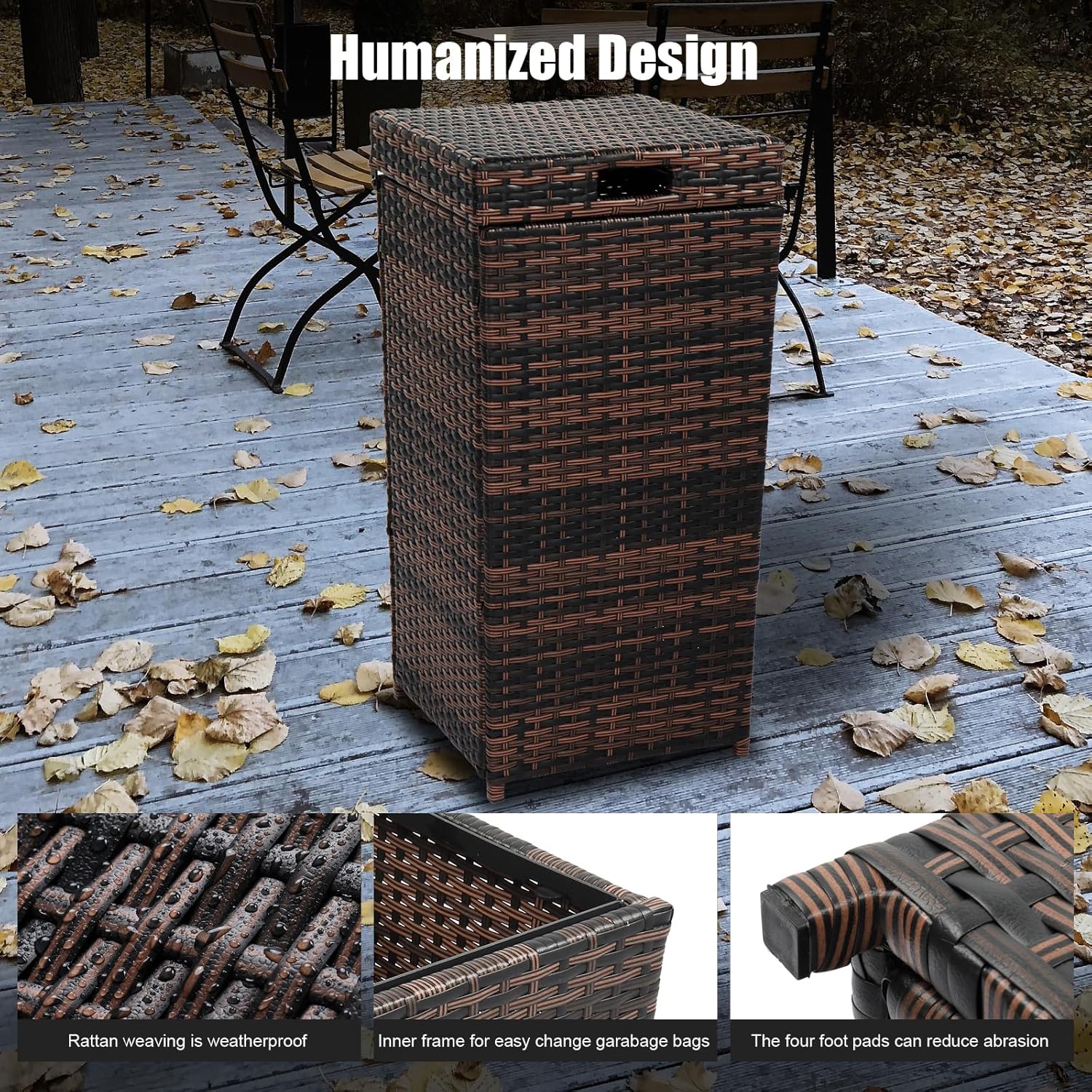 - Durable & Sturdy: Our patio trash can is crafted from UV-resistant PE rattan and a steel frame, ensuring it remains sturdy, stable, and long-lasting