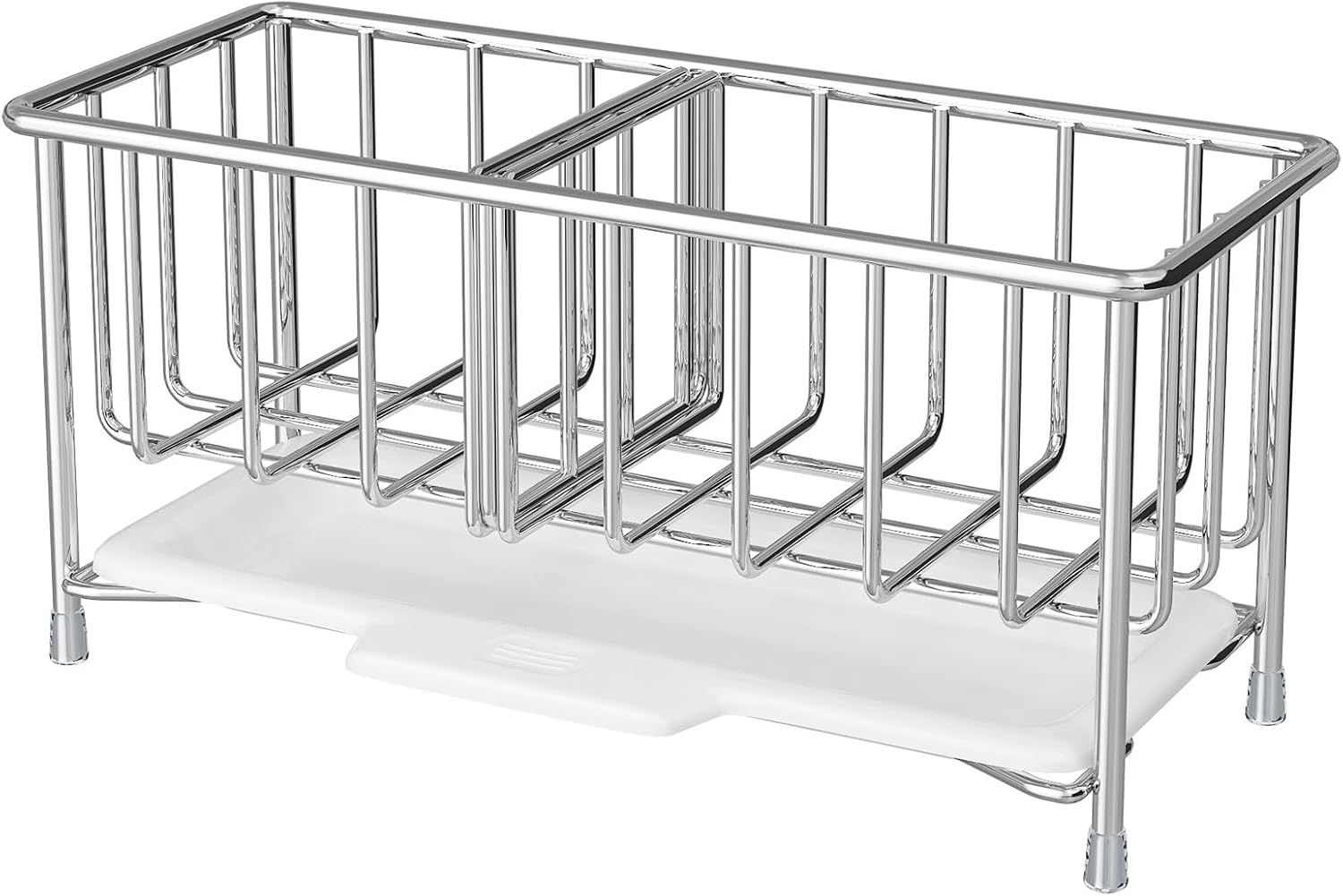 - ăDry and Ventilatedă This kitchen sink sponge holder features a split-sink design with a removable tray, which can effectively drain the moisture from kitchen cleaning tools and make them dry faster. The discharged moisture falls on the tray for easy pouring and cleaning, which can always keep the desktop clean and tidy, and keep it dry and ventilated