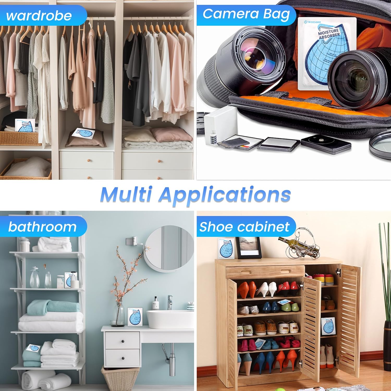- ăVersatile Usageă: Moisture absorber packets can be used in various locations, including closets, wardrobes, basements, laundry rooms, households, bathrooms, kitchens, shoe cabinets, cars, cat litter boxes, toolboxes, RVs, campers, and other enclosed spaces. These moisture absorber bags effectively protect your valuables from damage caused by excess moisture and prevent smells. Remember to keep the paper side facing up for optimal performance.
