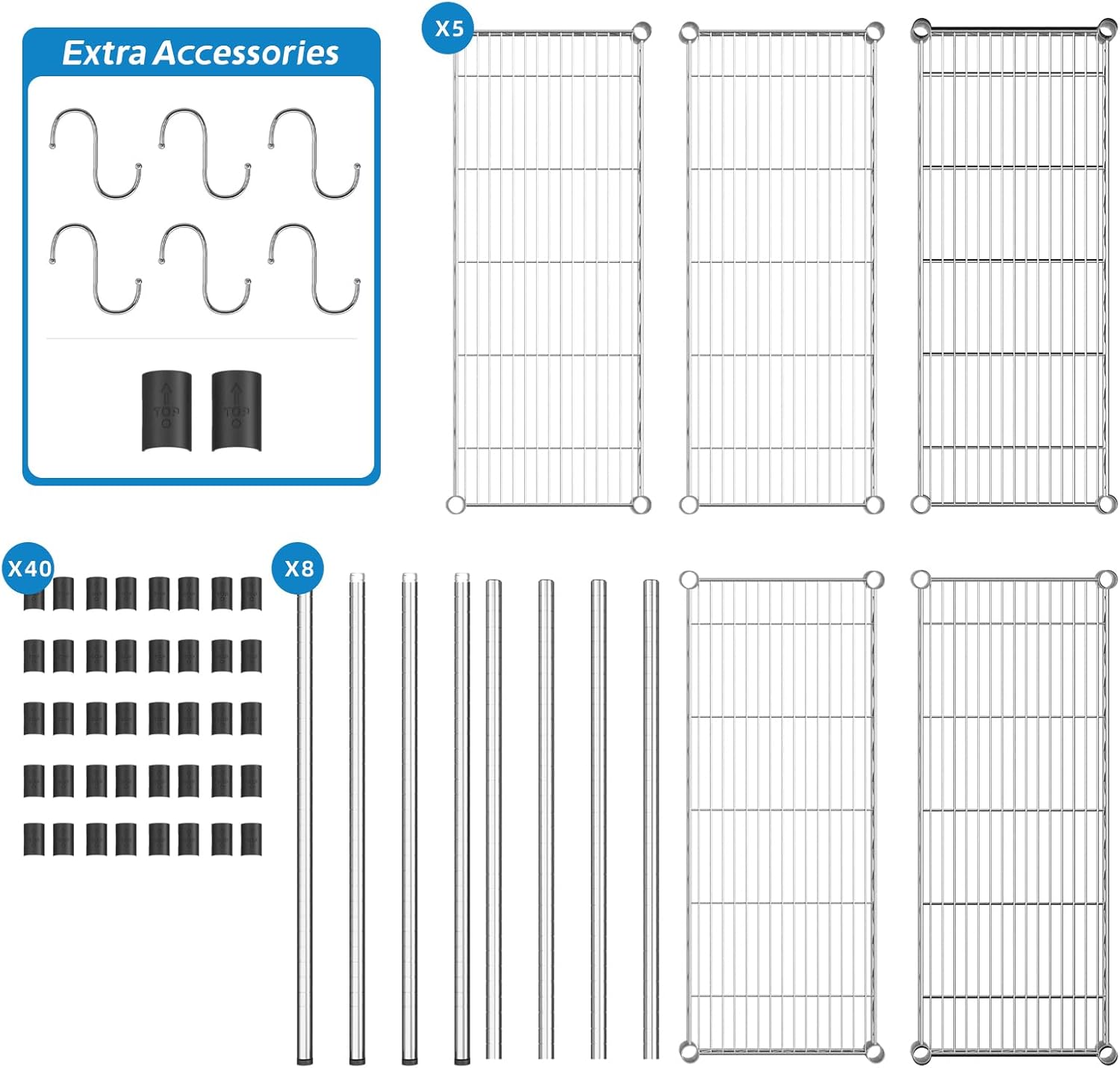 - What You Will Get: This Wire Shelving include: 5 pieces of Metal Mesh Board, 4 pcs Upper Pole,4 pcs Bottom Pole, 40 pcs Clips; Additionally, an additional 2 clips and 6 metal hooks are included
