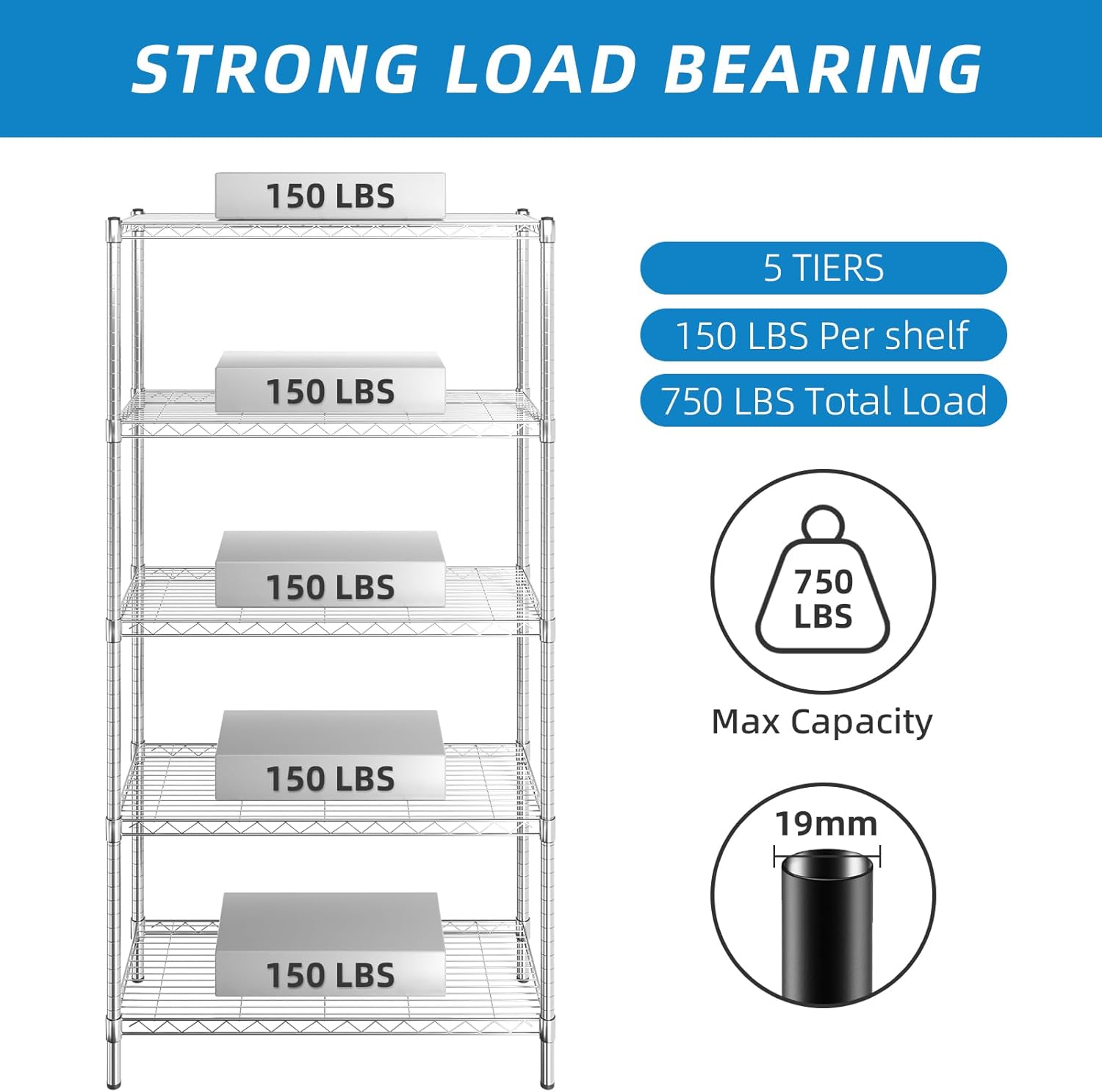 - 100% Assured Purchase,Quick Response,After-Sales Service within 24 hours: This 5 Tier Shelf is sturdy, smooth and durable, we guarantee you will love this Wire Shelving. However, if you are not satisfied with this item or encounter any questions about missing parts or assembly, please feel free to contact us through the "Buyer Message" function, our After-Sales team will respond quickly within 24 hours and will provide you with the most professional technical support and the best solutions