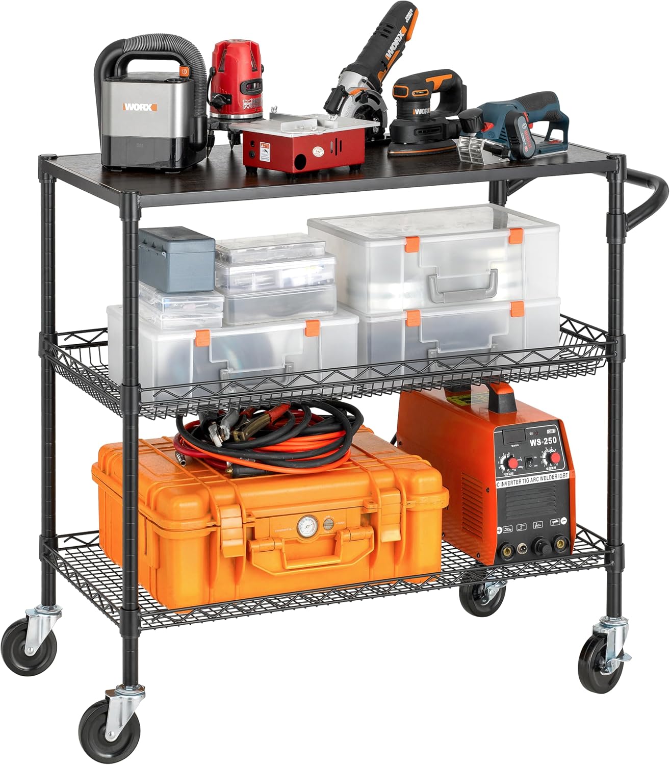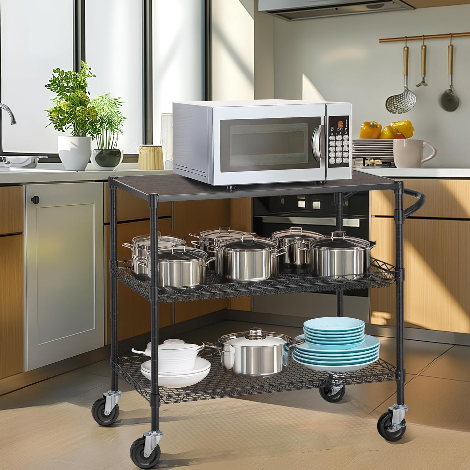 - MUTI-FUNCTIONAL - 3 Shelves unit on 4 inches industrial wheels (2 with brake) to hold and move many small and large appliances. Ideal for using in kitchens, warehouses, garages, offices and restaurants, simplified the transporting of heavy and bulky loads. This mobile cart comes with a convenient handle push-bar and a ventilated basket. The shelves can be adjusted at one-inch intervals.