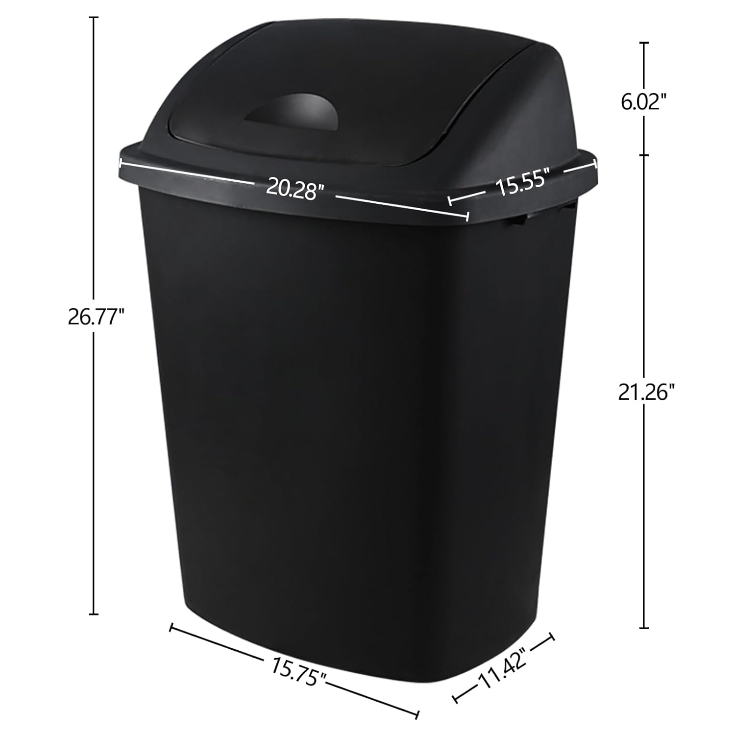 - Top size: 20.28" x 15.55" x 6.02"; bottom size: 15.75" x 11.42" x 21.26"; total height: 26.77"