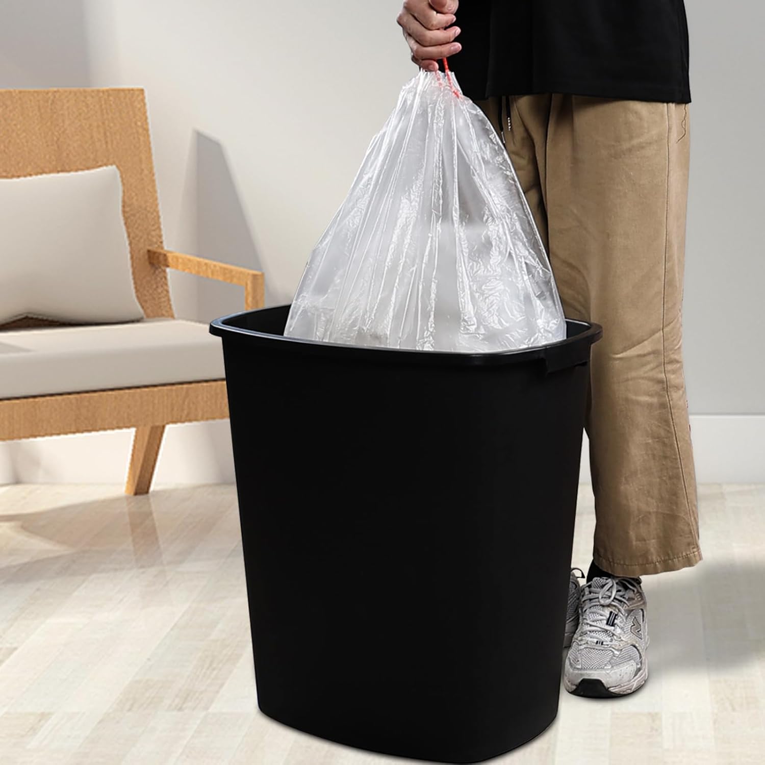 - The handle design on the flip cover allows for easy opening and disposal of garbage. The cover can secure the garbage bag and keep it clean. The bucket body with a handle is easy to move