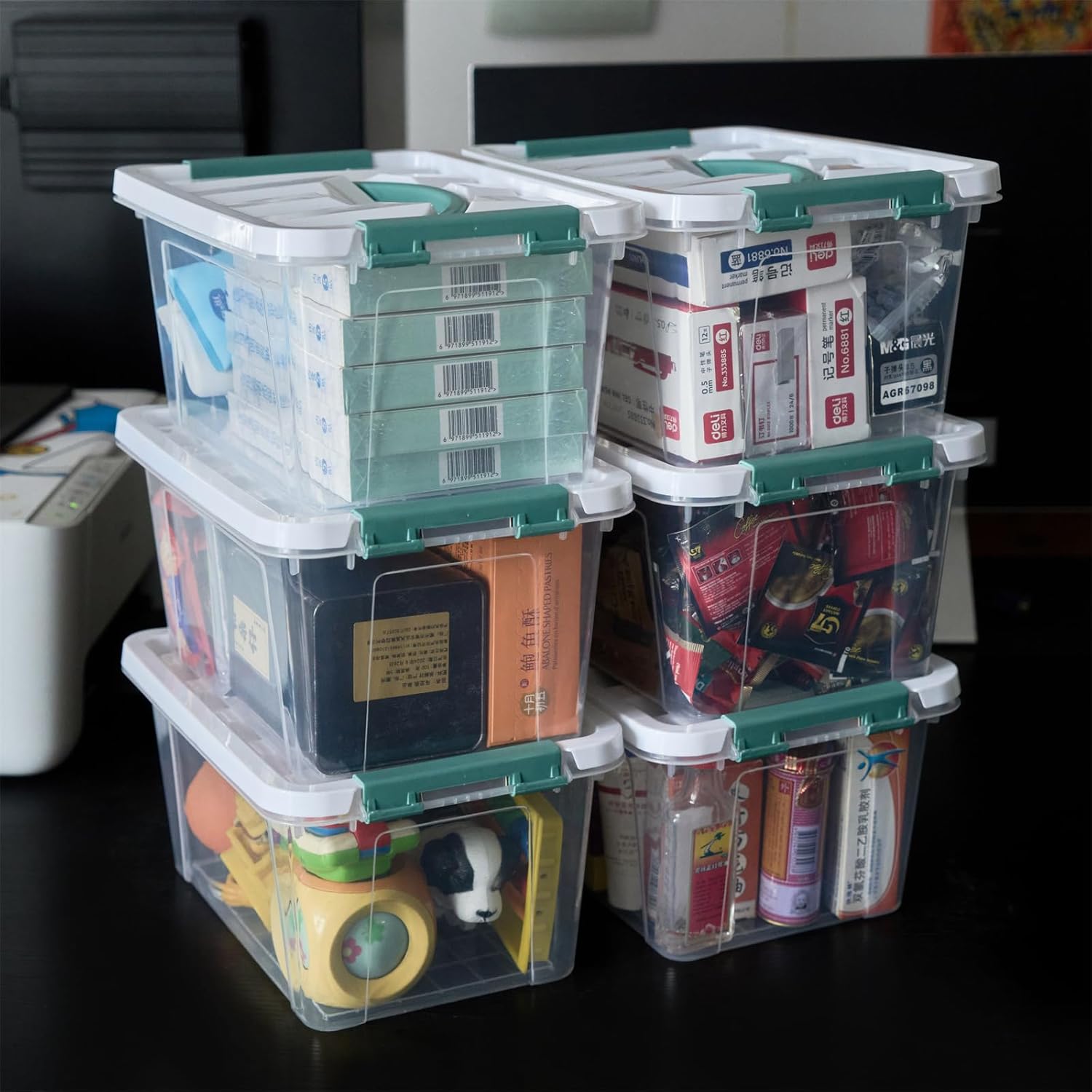 - Include 6-Pack plastic storage organizer latching box/bins