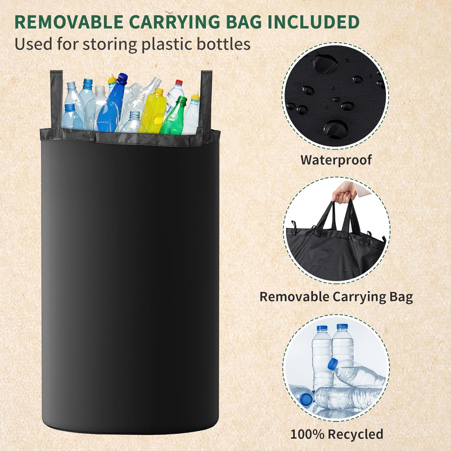 - REMOVABLE INNER CARRYING BAG - Recycling bin with lid has a waterproof inner bag that is securely fastened with high-quality horn clips to prevent the bag from falling or slipping. The carrier bag can be removed to take the deposit bottles with you