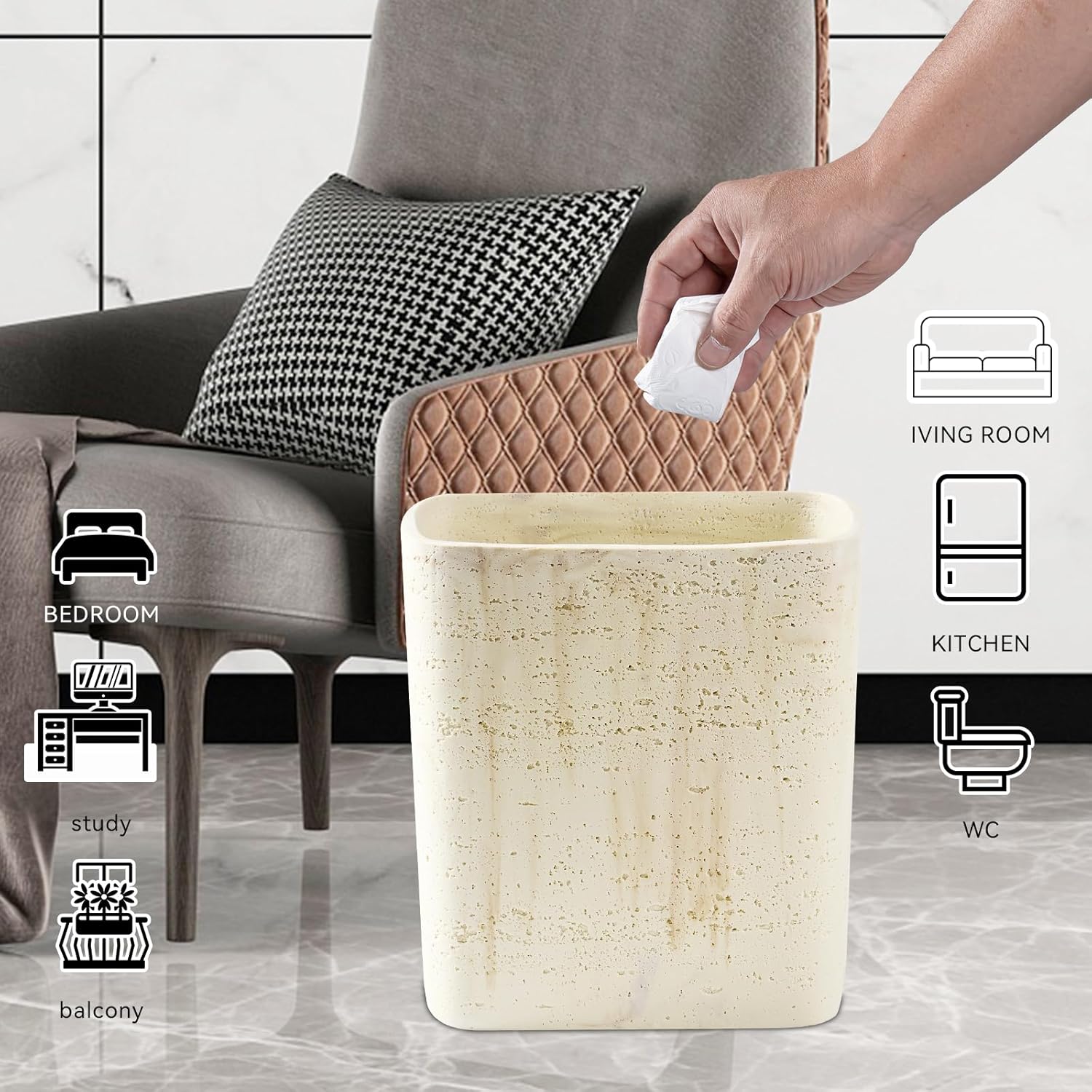 Polytree Natural Travertine Textures Bathroom Trash Can 1.8 Gallon(7 Liter) Small Kitchen Garbage Can,Living Room Bedroom Trash Can, Decor Wastebasket for Home Office (Handmade of Resin)