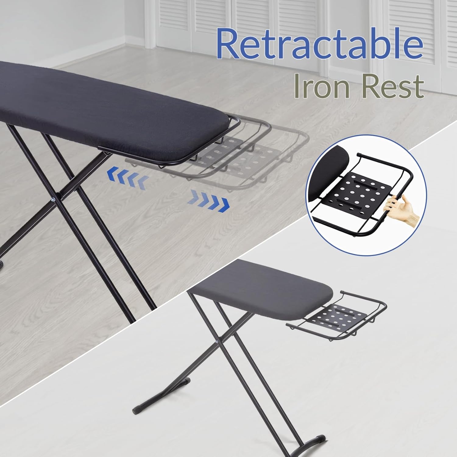 - Retractable Iron Rest: The special retractable safety iron bracket holds the iron safely in place when not in use, preventing accidental burns and damage to garments.