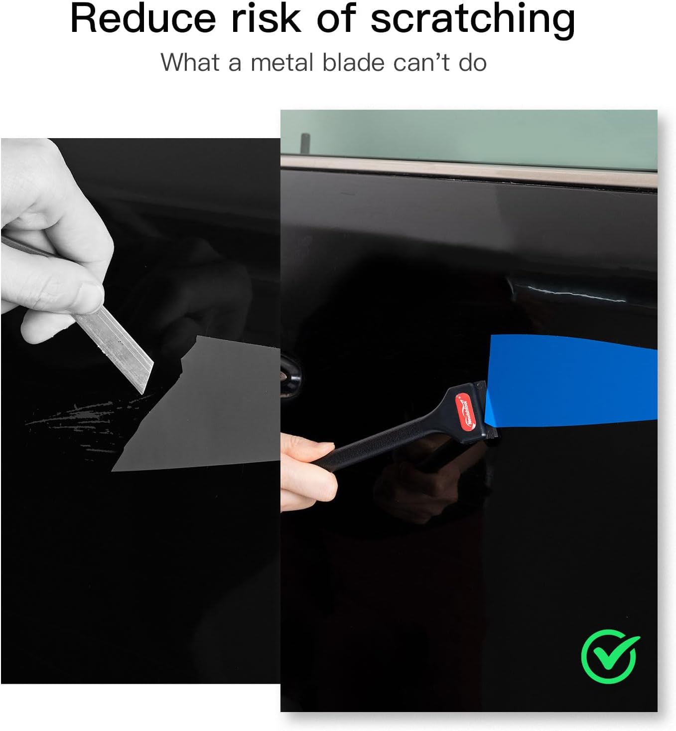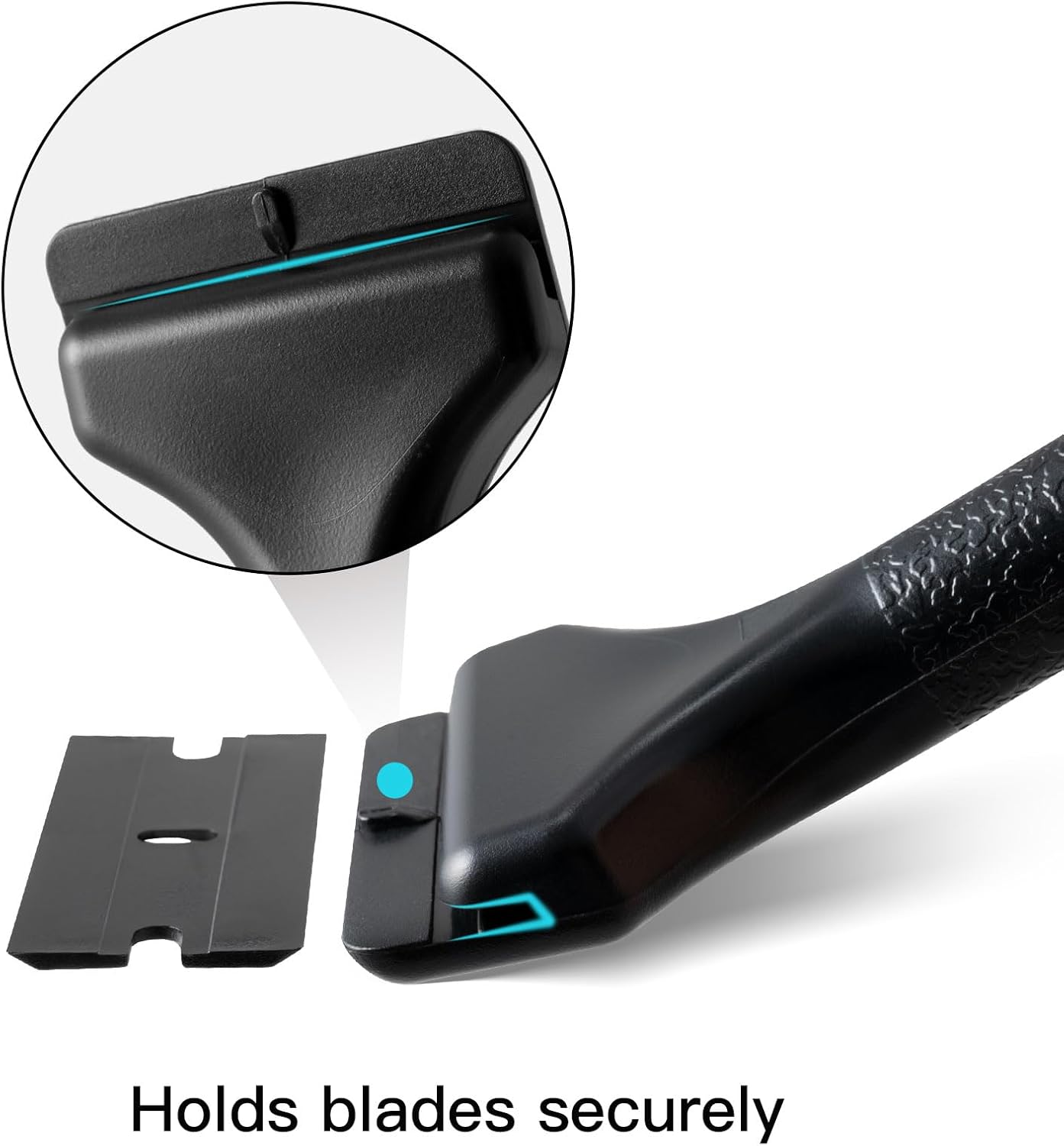- PLASTIC SCRAPER TOOL includes 2pc plastic razor blades with long handle and 100pcs replacement plastic blades, giving you more durability and flexibility to complete heavy tasks. A safety sticker remover to work on glass, ceramic materials.