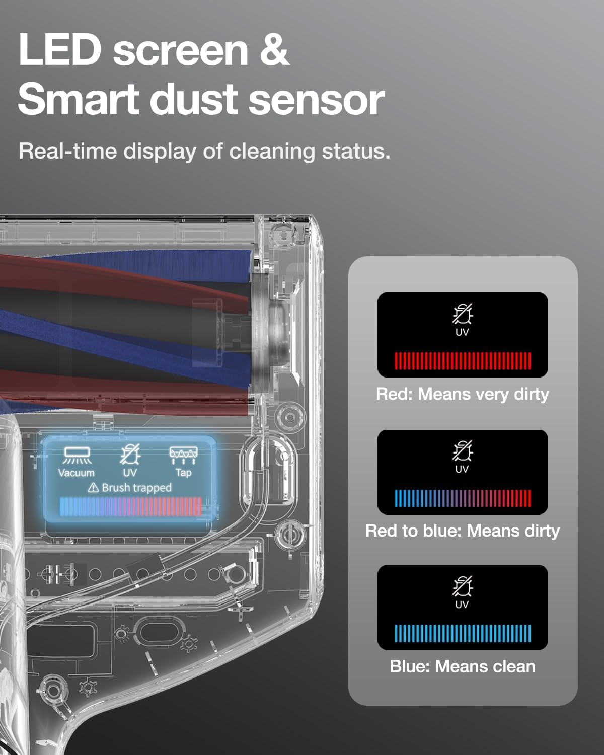 - šššš¤š„š šš¢šššš§ ššš¬š¬ šš¦šš«š: The built-in high-intelligence dust sensor quickly identifies dust levels on fabrics and displays the results via LED. Red indicates dirty, blue indicates clean, allowing you to monitor cleaning progress in real time.