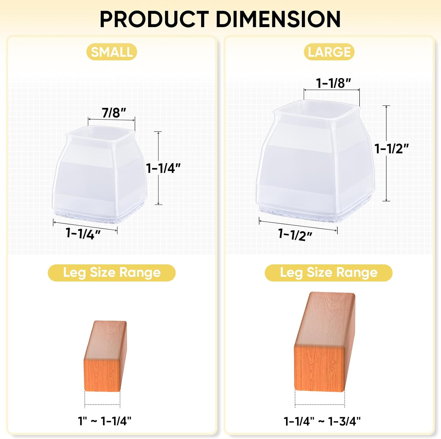 - [SIZE GUIDE] The Round-Small cap fits both round and square chair legs with a diameter of 1" to 1-1/4", the Round-Large cap fits both round and square chair legs with a diameter of 1-3/8" to 1-1/2", the Round-X Large cap fits both round and square chair legs with a diameter of 1-3/4" to 2-1/4". The Square-Small cap fits square chair legs measuring 1" to 1-1/4", and the Square-Large cap fits square chair legs measuring 1-1/4" to 1-3/4".