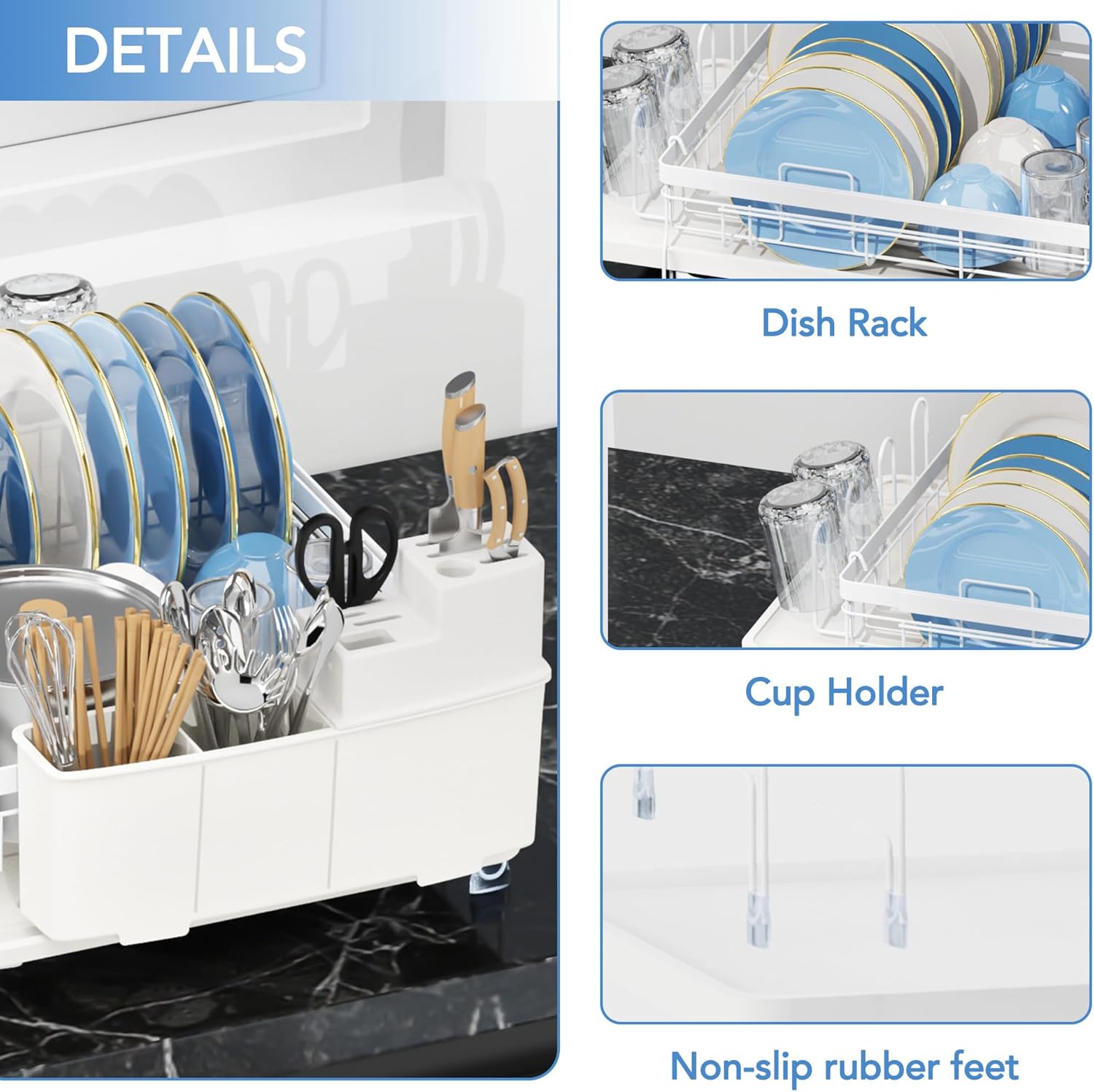 - Premium Anti-rust Material:ROTTOGOON dishrack is made of premium PP plastic and stainless steel which can effectively keep away rust, corrosion and scratch. Dish drying rack equipped with 6 anti-slip rubber feet prevents scratches, falls, and reduces noise. The sturdy structure and the elevated rail help to keep the rack stable and prevent it from tilting.