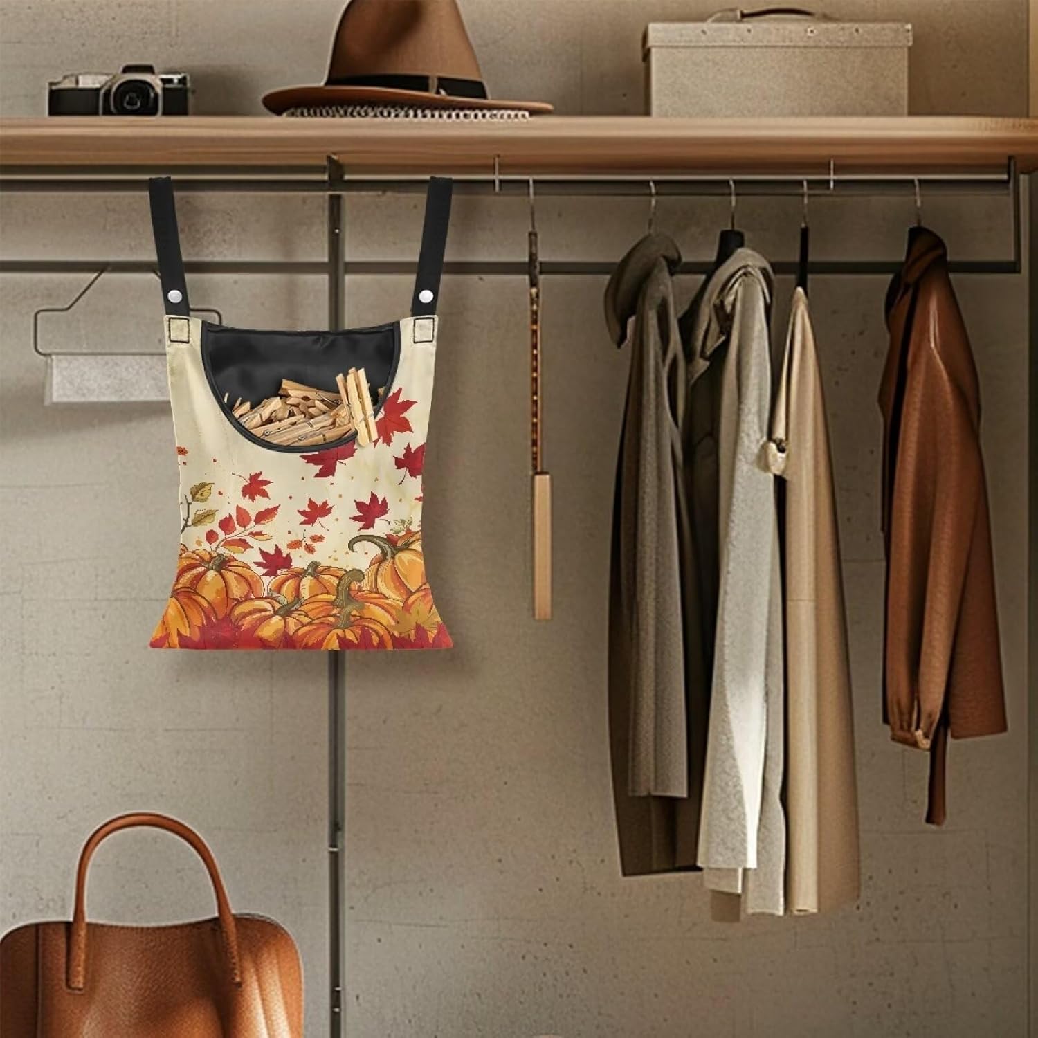 Maple Leaf Clothespin Bag Thanksgiving Pumpkin Hanging Storage Organizer Clothes Pin Bag Waterproof Laundry Clothespin Bag Clothespin Holder for Clothesline Outdoor