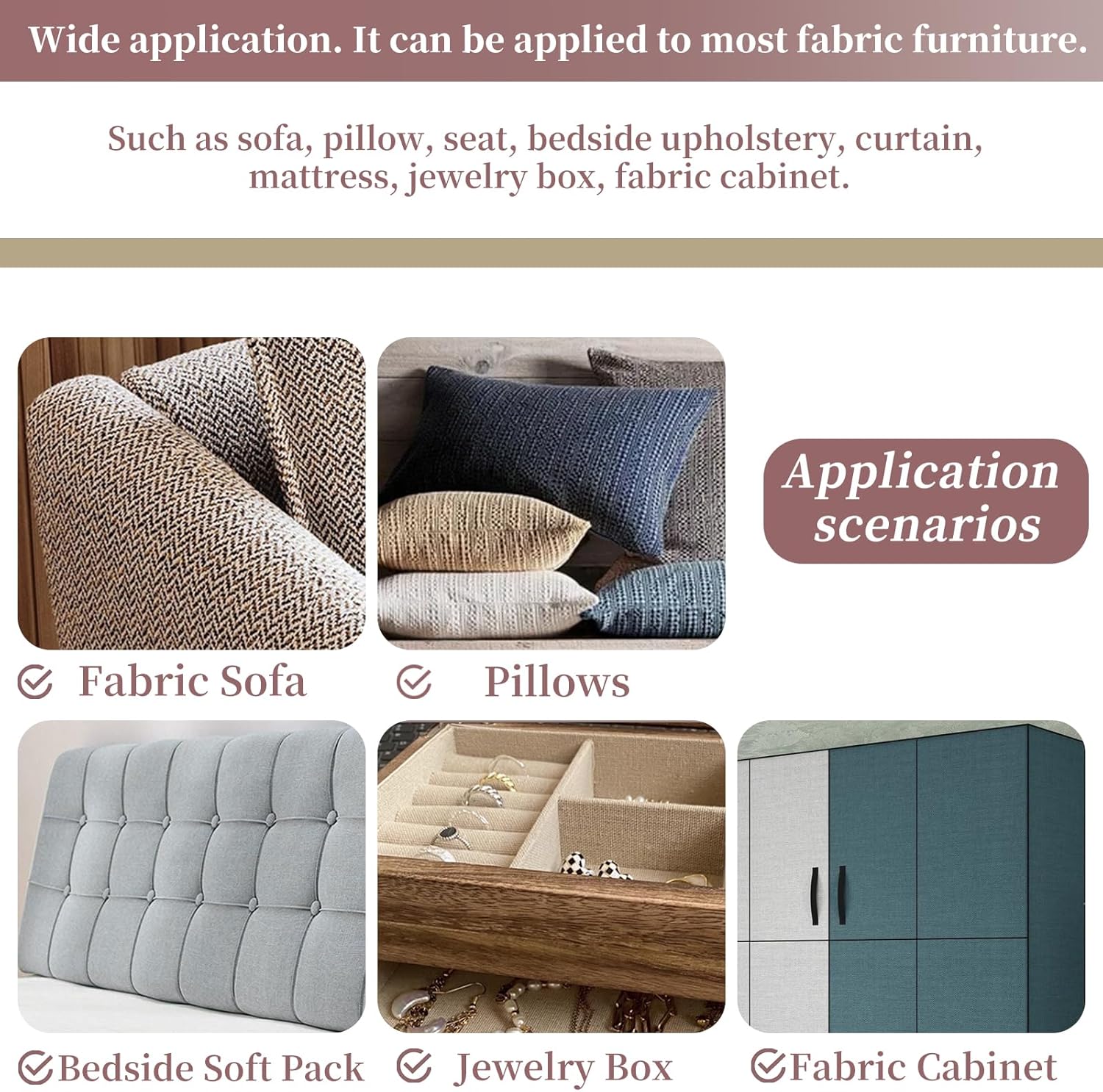 - USING FABRIC-SPECIFIC ADHESIVE:Extremely strong adhesion, the longer the paste the more solid, not easy to fall off, perfect fit with the furniture, remove no residual glue, will not damage the furniture, so that the appearance and sense of use has been significantly improved, practical and cost-effective