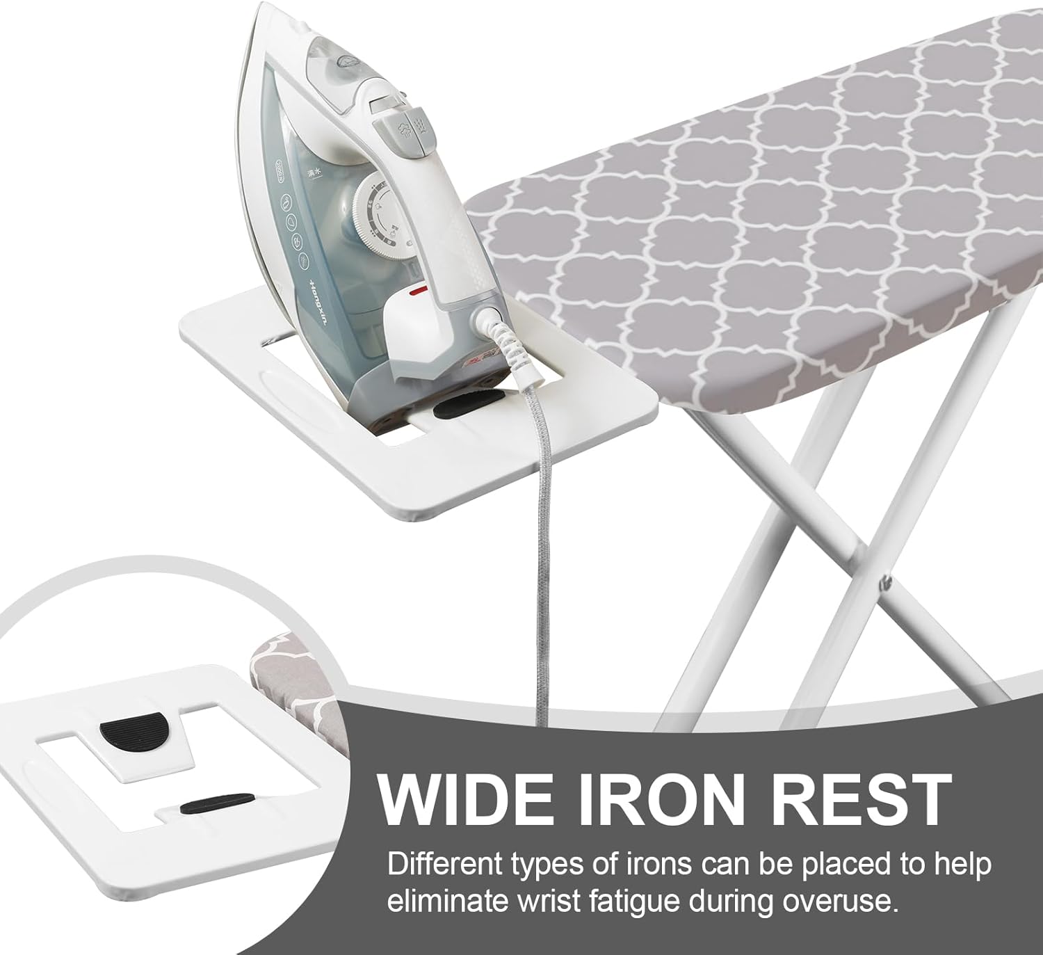 - Portable Iron Stand: Our iron board not only has a wide ironing surface of 39.4x13.4 inches, but also provides ample space for ironing various clothes. And it is also equipped with an iron stand, which can place the iron to better maintain good heat dissipation and help eliminate wrist fatigue during overuse.