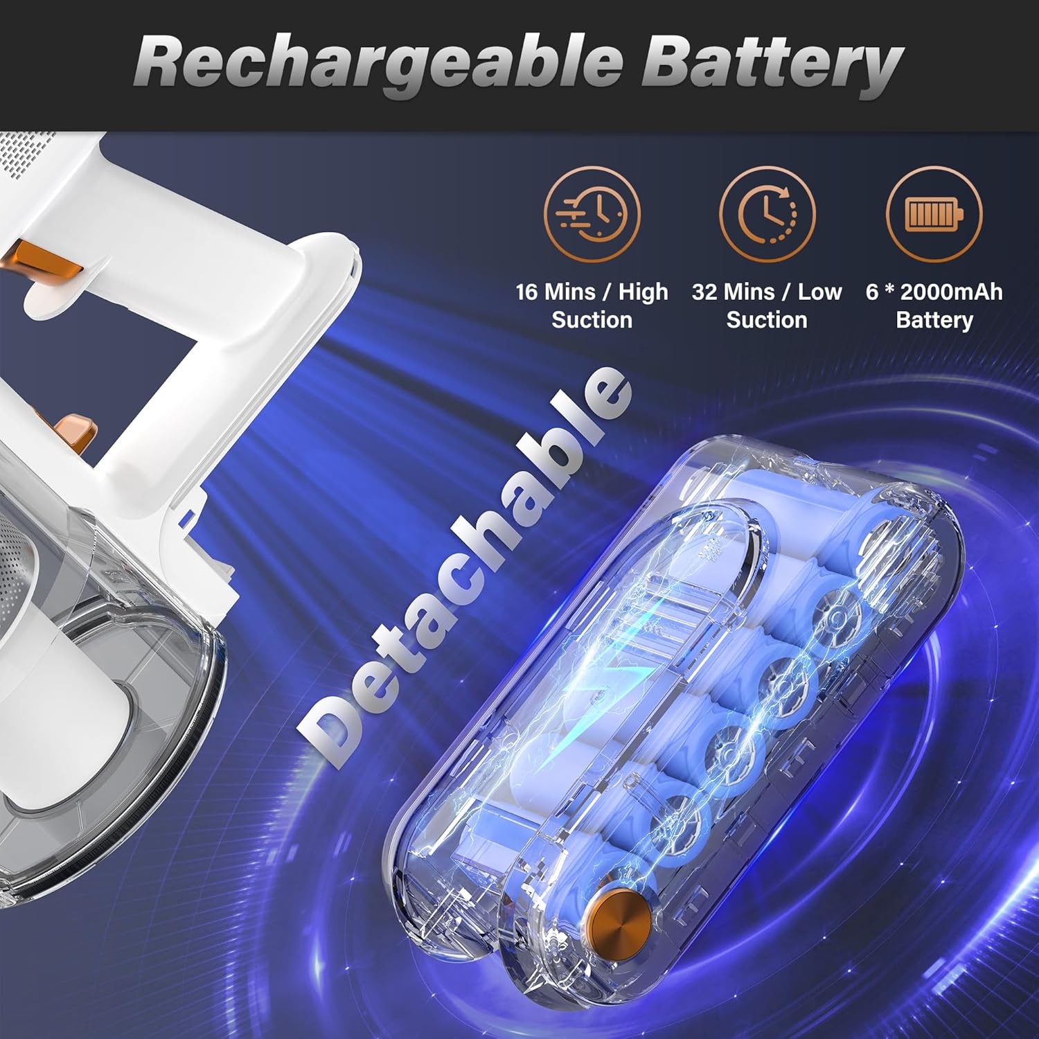 • Wall-Mounted Charging Dock: Featuring a 6*2000 mAh rechargeable battery and a wall-mounted charging station, this cordless vacuum cleaner offers versatile charging options. You can detach the battery for separate charging or place the vacuum on the dock for automatic charging and convenient storage