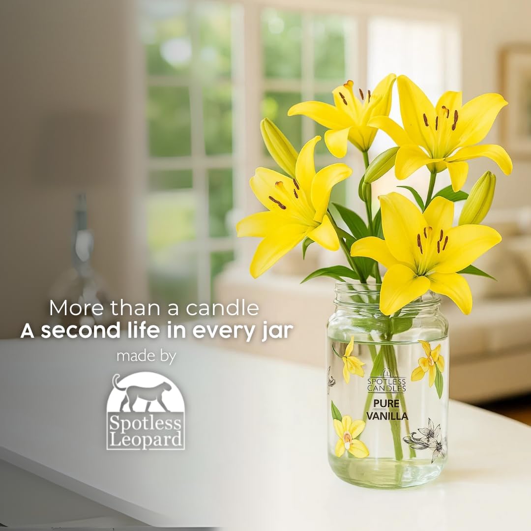 Vanilla Candle 22oz 16" x 9" Reusable Jar Candle 130 Hours Long Burn Time with Wooden Wick in Presentation Gift Box & Protective Shipper Spotless Leopard