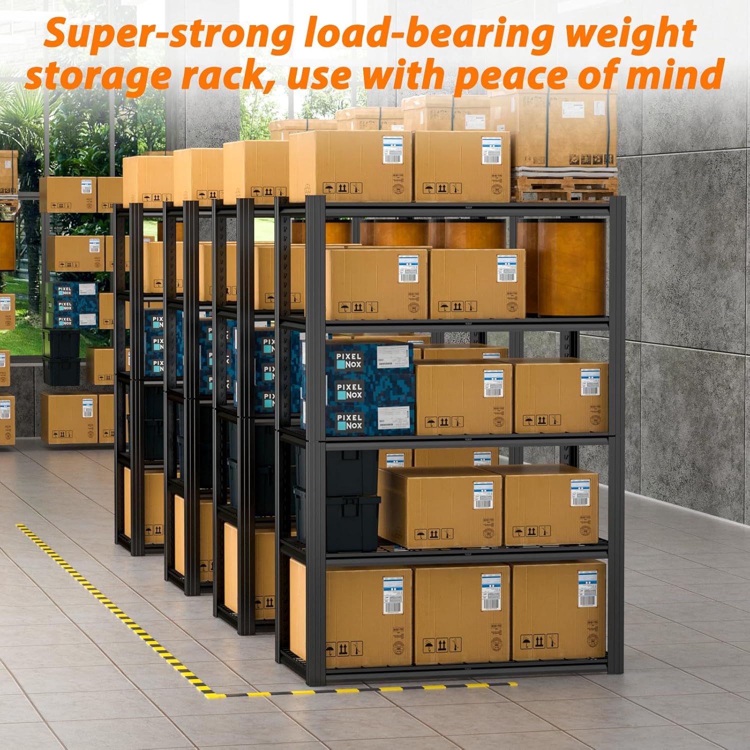 - ă2800 LBS Heavy Duty ShelvingăThis heavy duty garage shelving unit has thickened double metal legs. Made of high-quality metal, each solid thickened metal shelving with 1 upgrade support strip beneath can hold up to 560 lbs, with a total bearing capacity of 2800 lbs, which makes industrial garage shelves heavy duty more stable and solid than normal metal shelves for storage and more stuff can be stored.